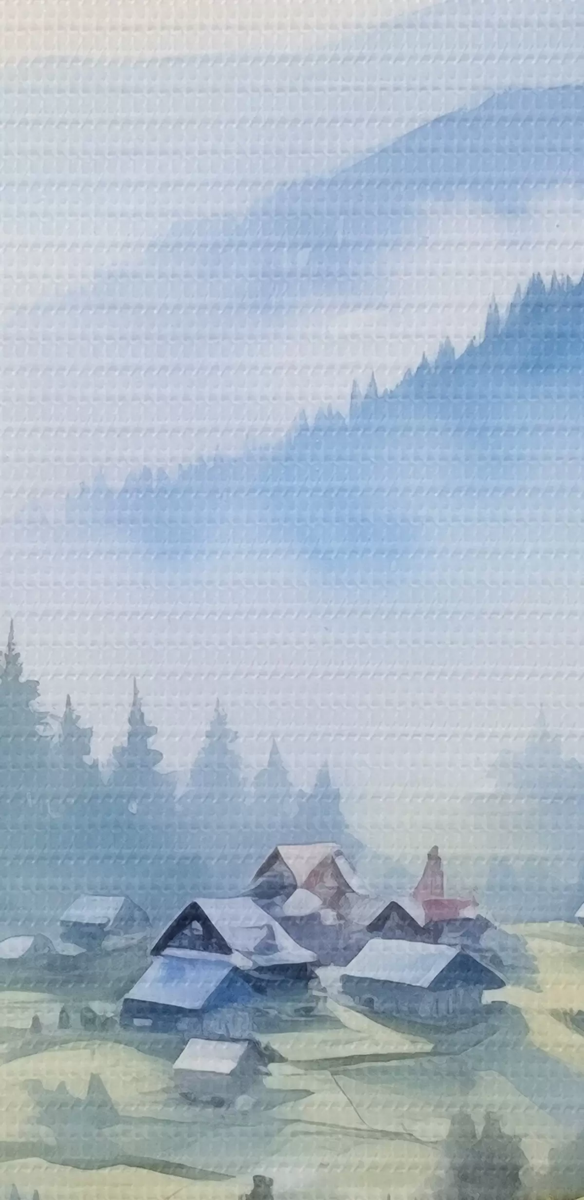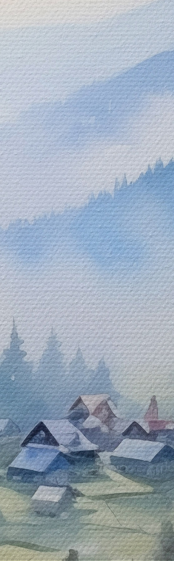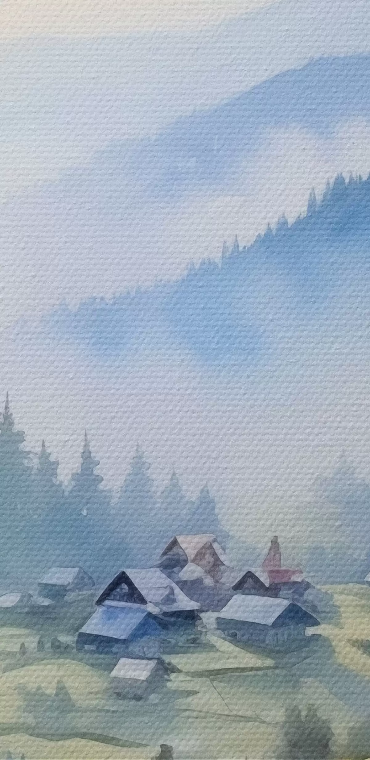 Gemälde Karpatendorf in den nebligen Bergen, Wald, Aquarell Art. s41648