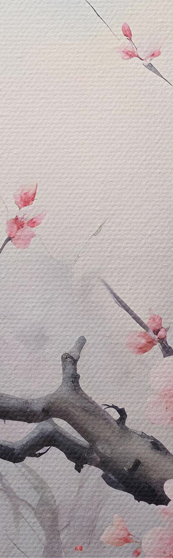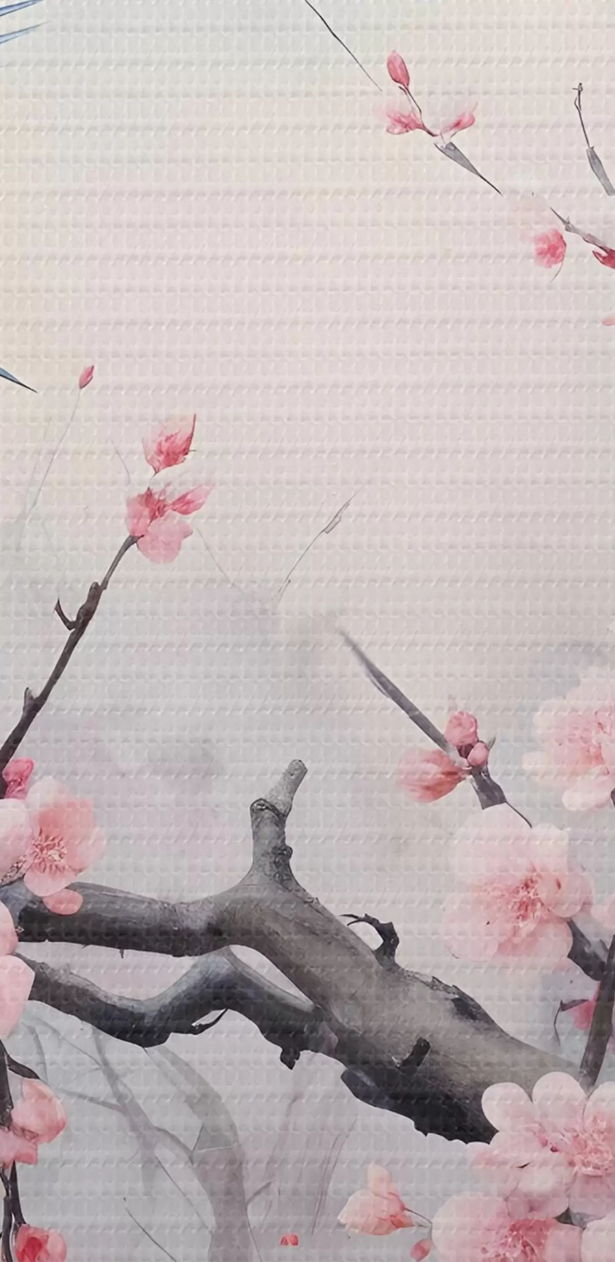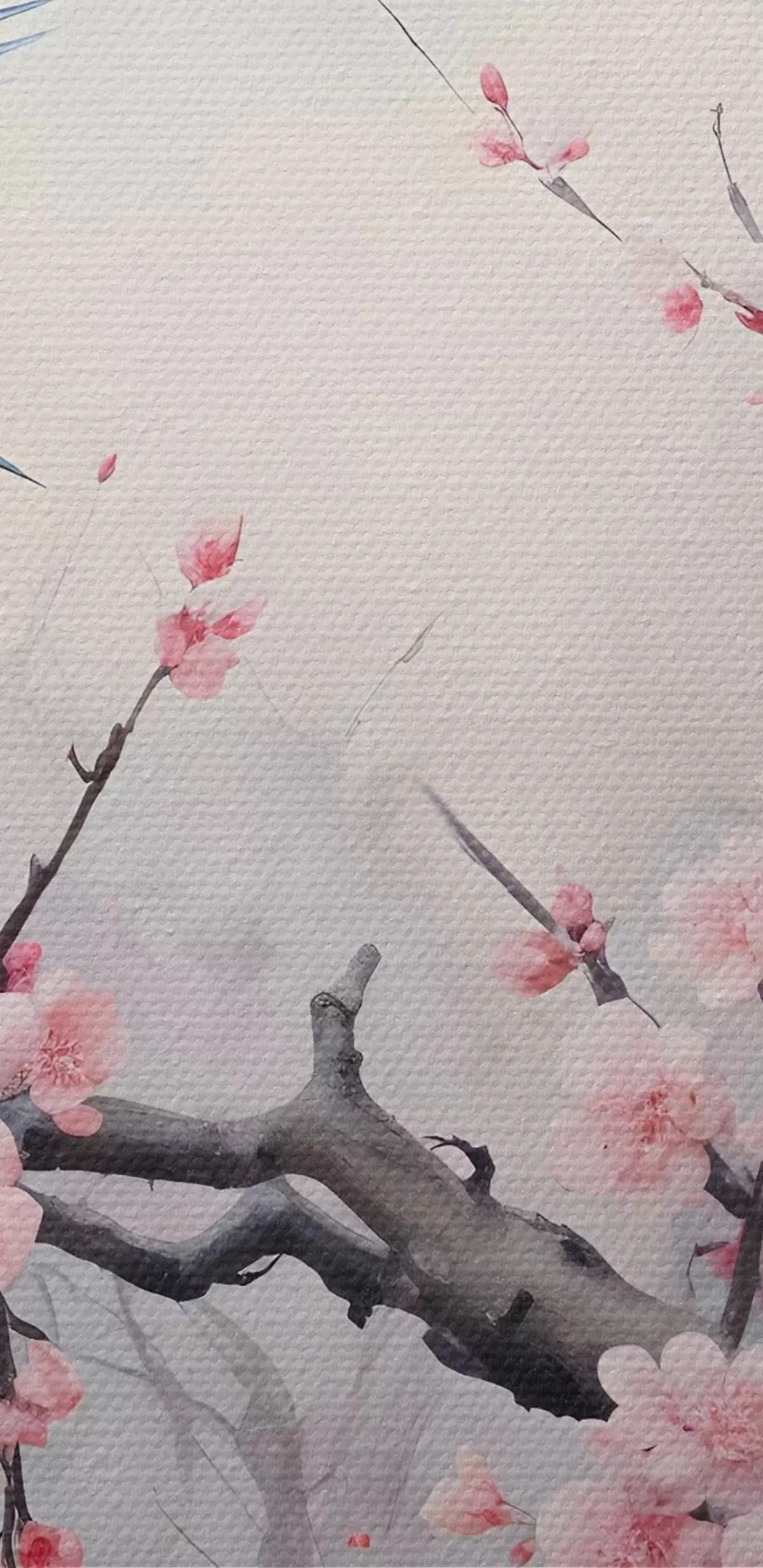 Gemälde Blauer Vogel fliegt zwischen rosa Kirschblütenblüten auf einem nebligen Frühling gedämpften Hintergrund Art. s41712