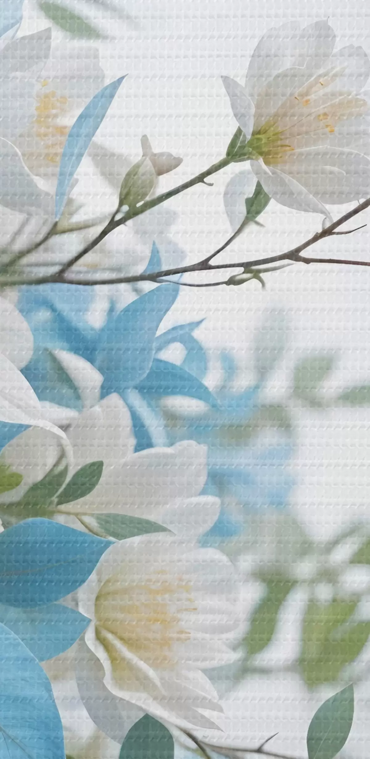 Fototapete Ein Blumenstrauß aus weißen und blauen Blumen mit grünen Blättern vor einem weichen, unscharfen Hintergrund s41715