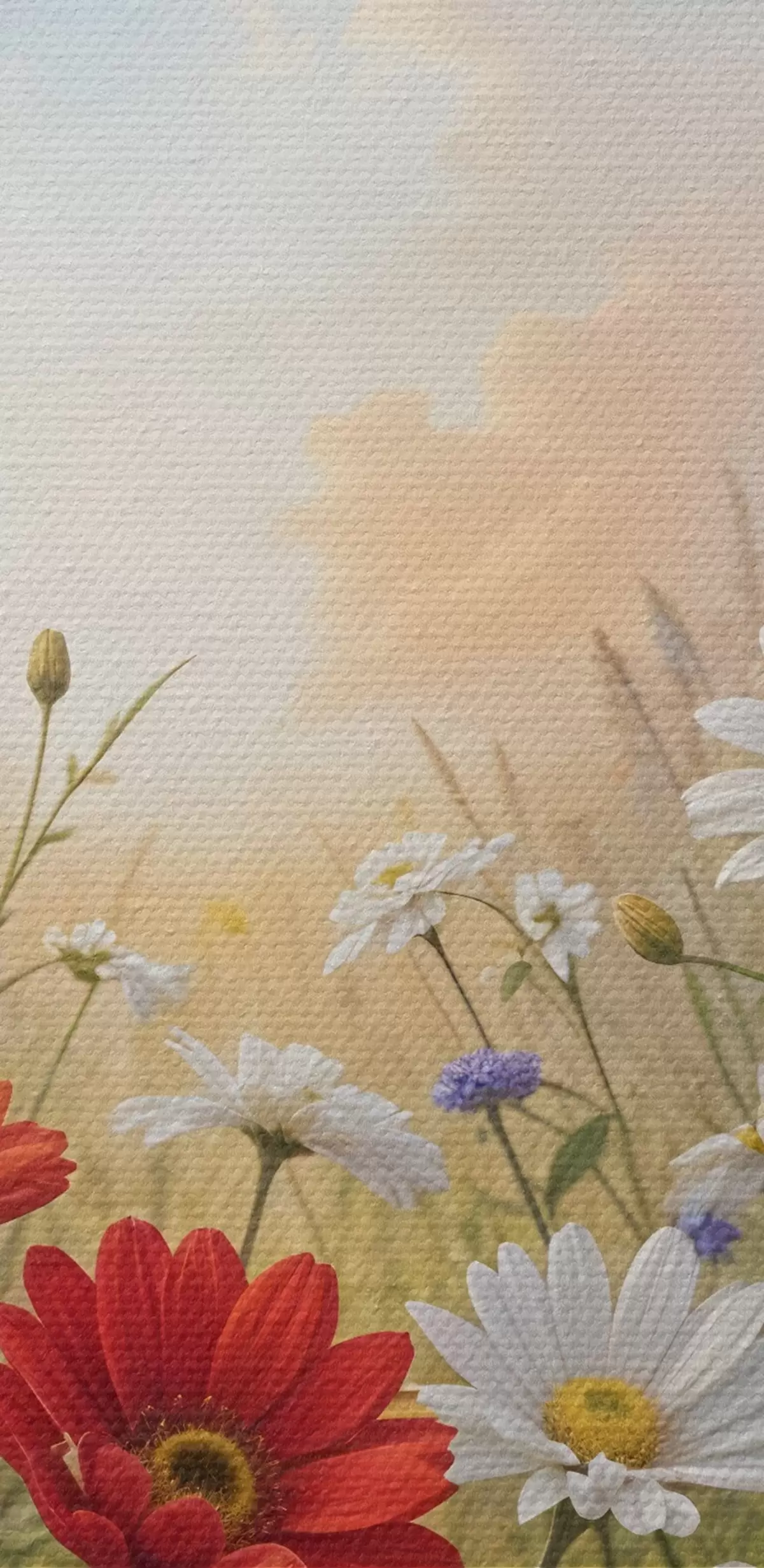 Gemälde Ein Feld mit farbenfrohen Wildblumen wie Gänseblümchen, Mohnblumen und anderen blühenden Pflanzen vor einem blauen Himmel Art. s41725
