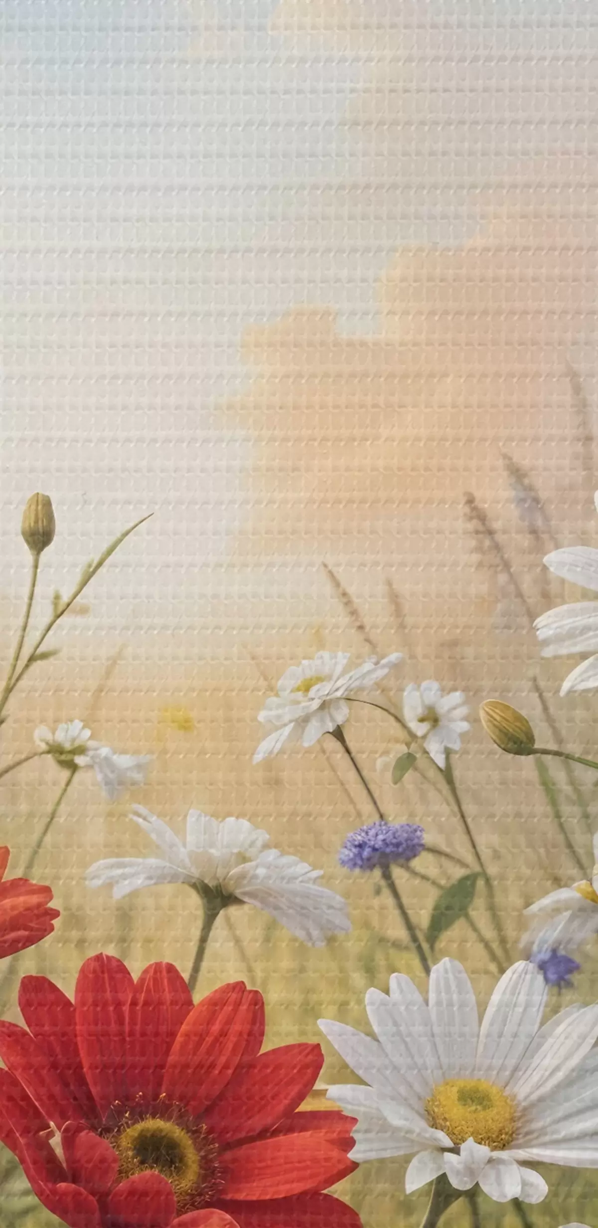 Fototapete Ein Feld mit farbenfrohen Wildblumen wie Gänseblümchen, Mohnblumen und anderen blühenden Pflanzen vor einem blauen Himmel  s41725