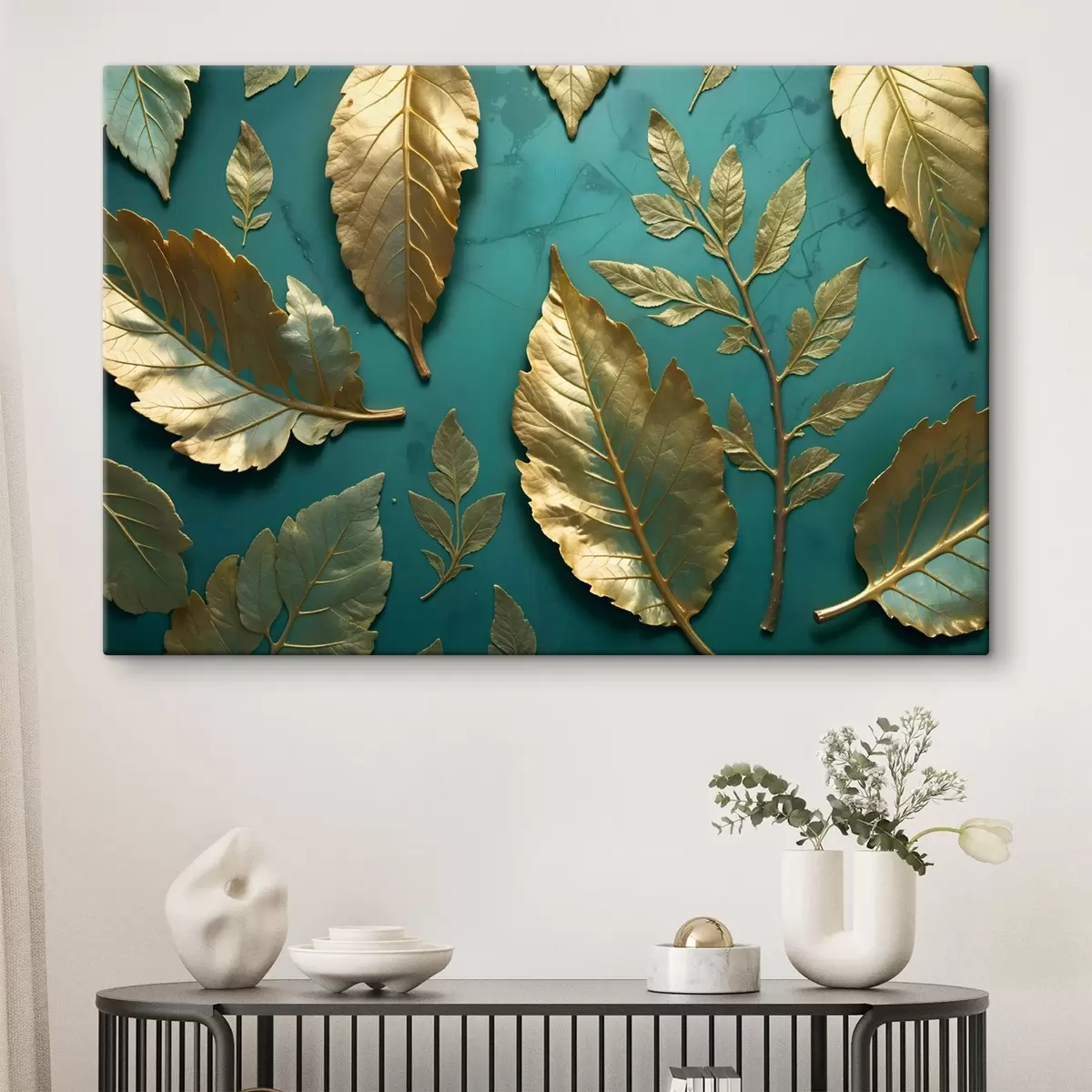 Gemälde Gelbe, zarte Blätter auf einem blaugrünen Hintergrund - ein eleganter botanischer Druck Art. s41727