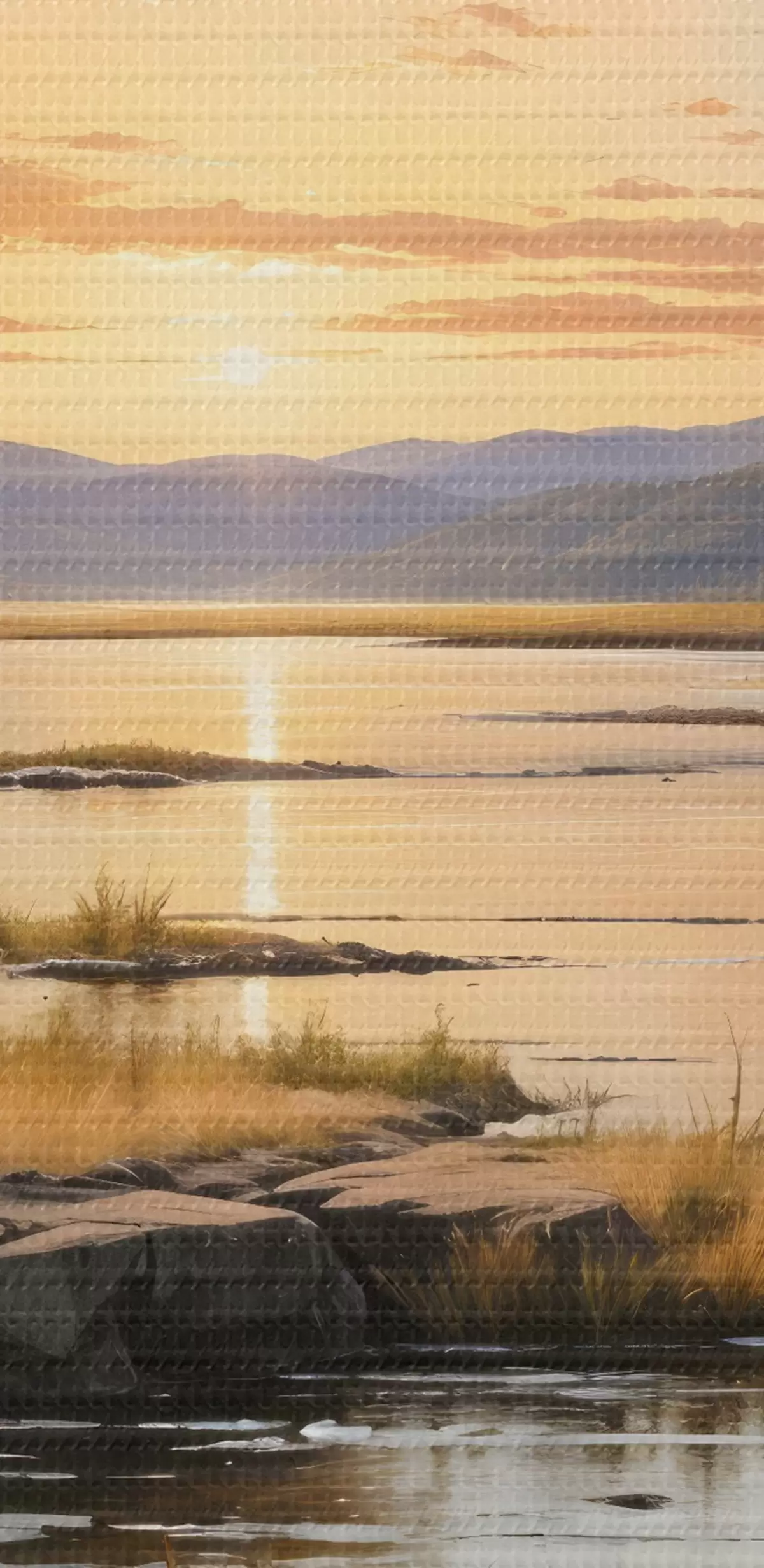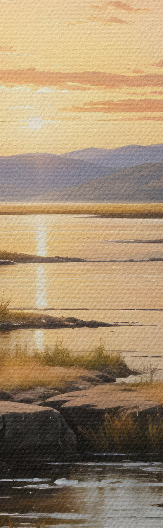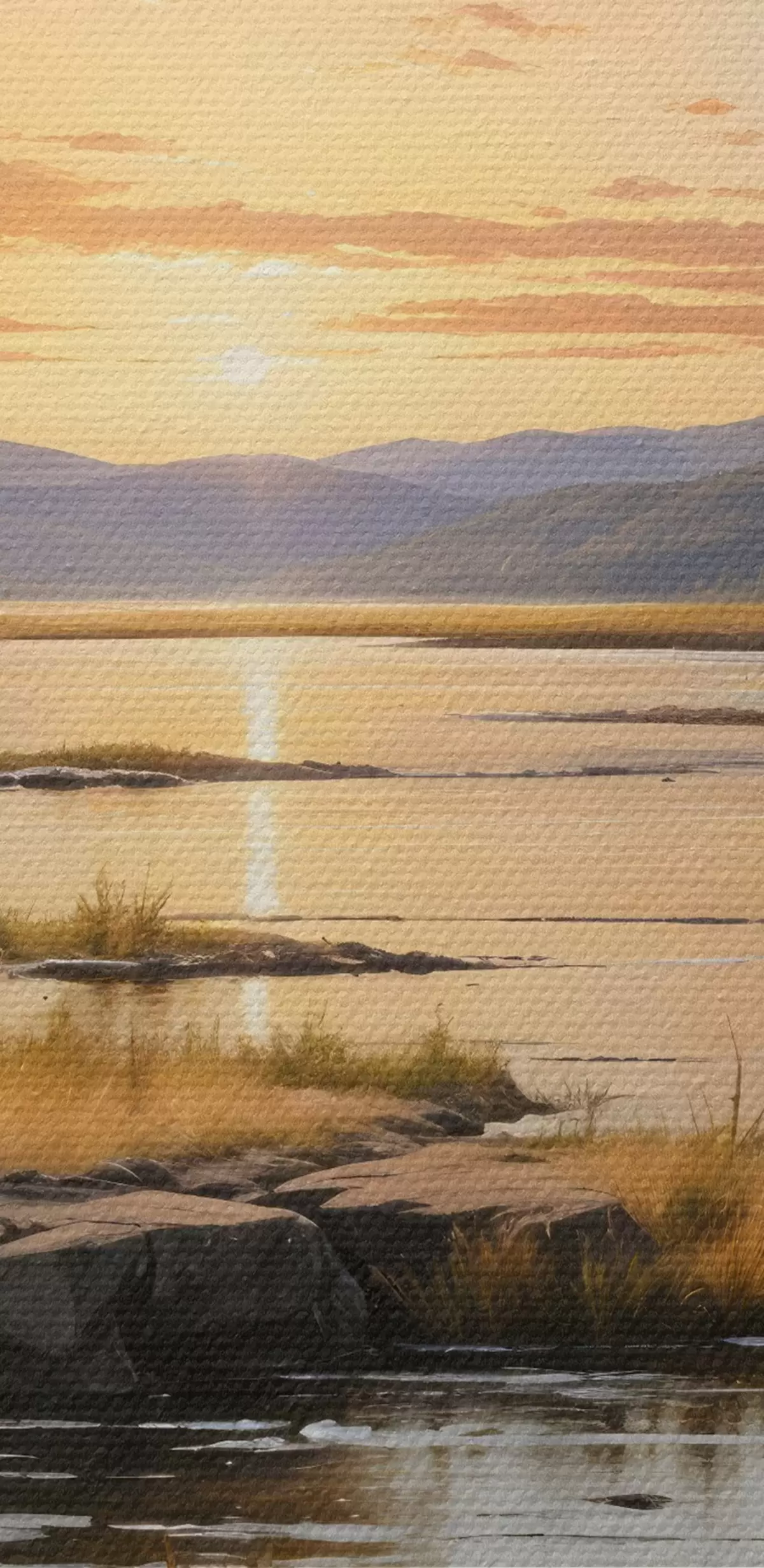 Gemälde Eine ruhige Landschaft mit einem von Kiefern umgebenen See, in dem sich die warmen Farben des Abendhimmels spiegeln Art. s41733