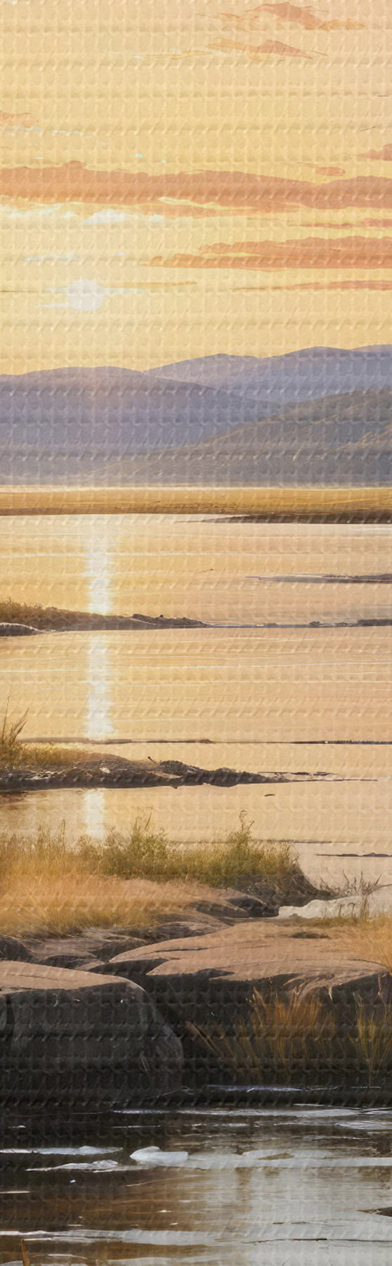 Fototapete Eine ruhige Landschaft mit einem von Kiefern umgebenen See, in dem sich die warmen Farben des Abendhimmels spiegeln s41733