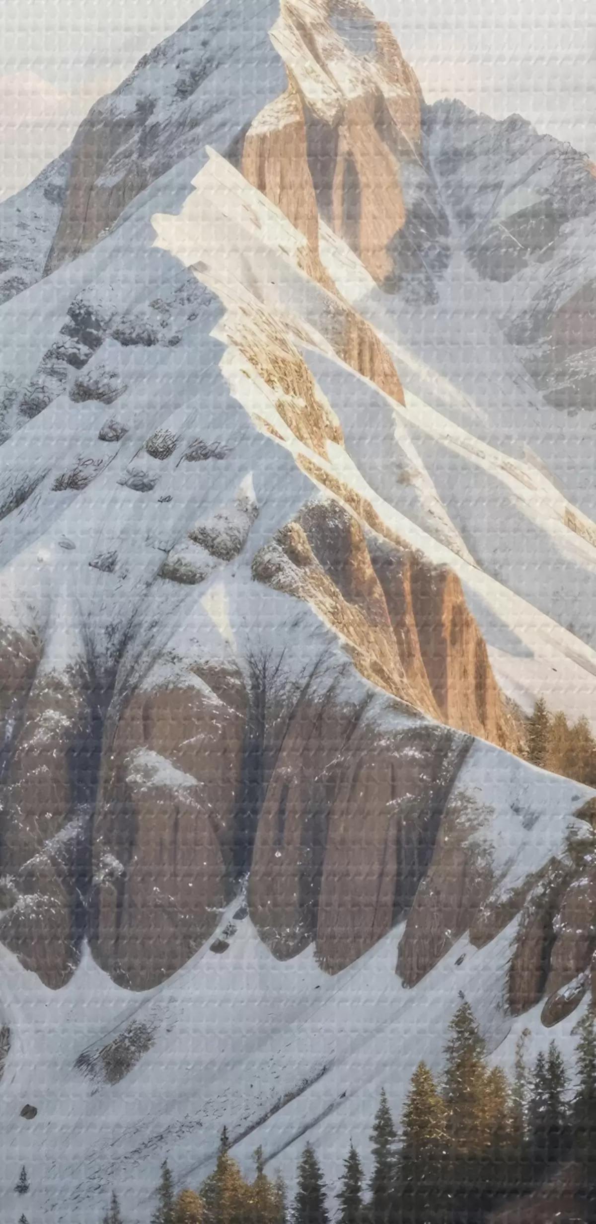 Fototapete Ein schneebedeckter Berggipfel, der sich über eine bewaldete Landschaft erhebt, mit Kiefern im Vordergund s41736