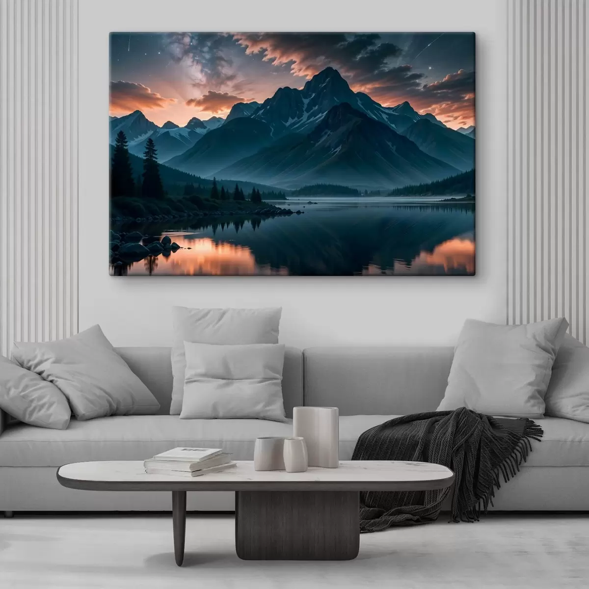 Gemälde Berglandschaft mit einem ruhigen See, in dem sich der Himmel spiegelt, umgeben von dichten Kiefernwäldern Art. s41739