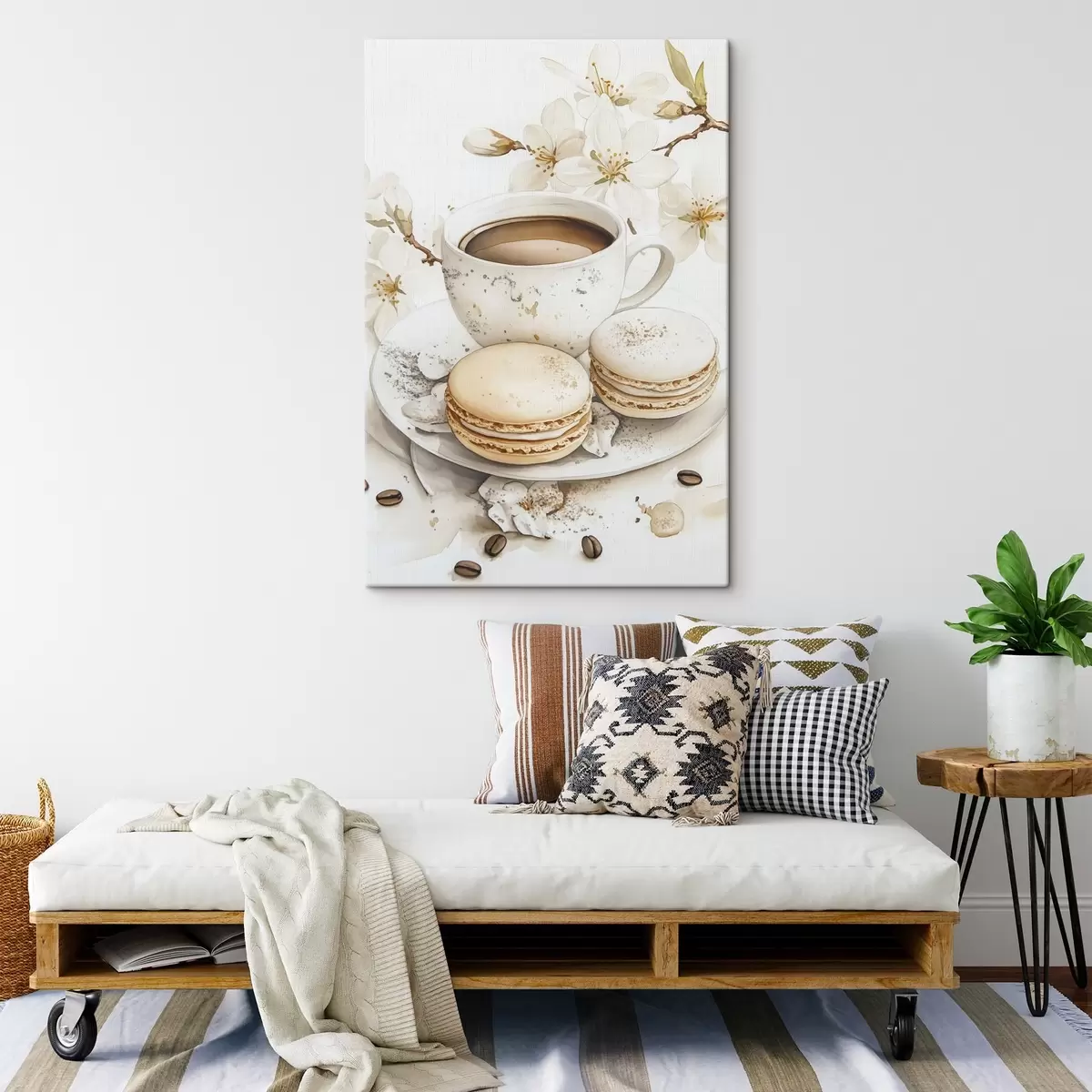 Gemälde Tasse Kaffee mit Makronen, Aquarellstil, weiche Farben, Jasminblüten Art. s41949