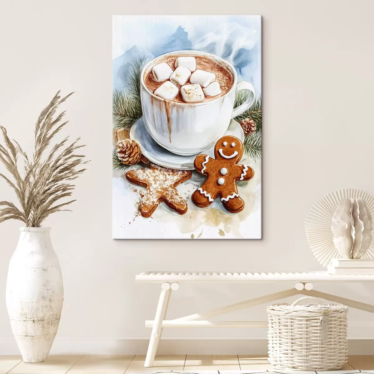 Gemälde Tasse Kakao mit Marshmallows, Lebkuchenmänner, Kekse, Tannenbäume mit Zapfen Art. s41952