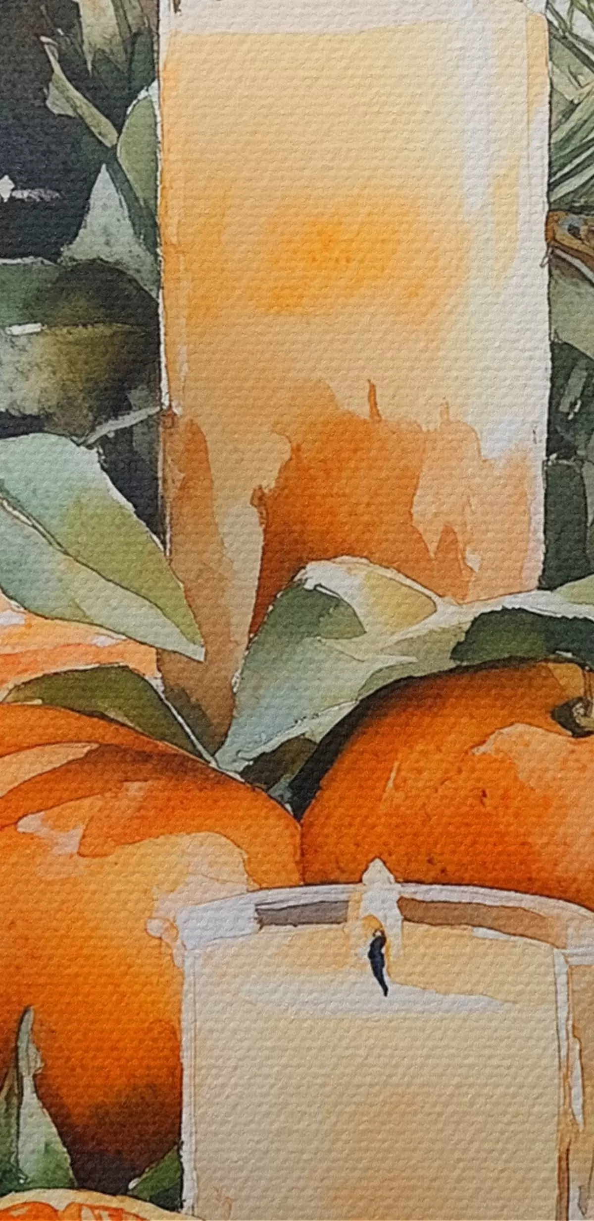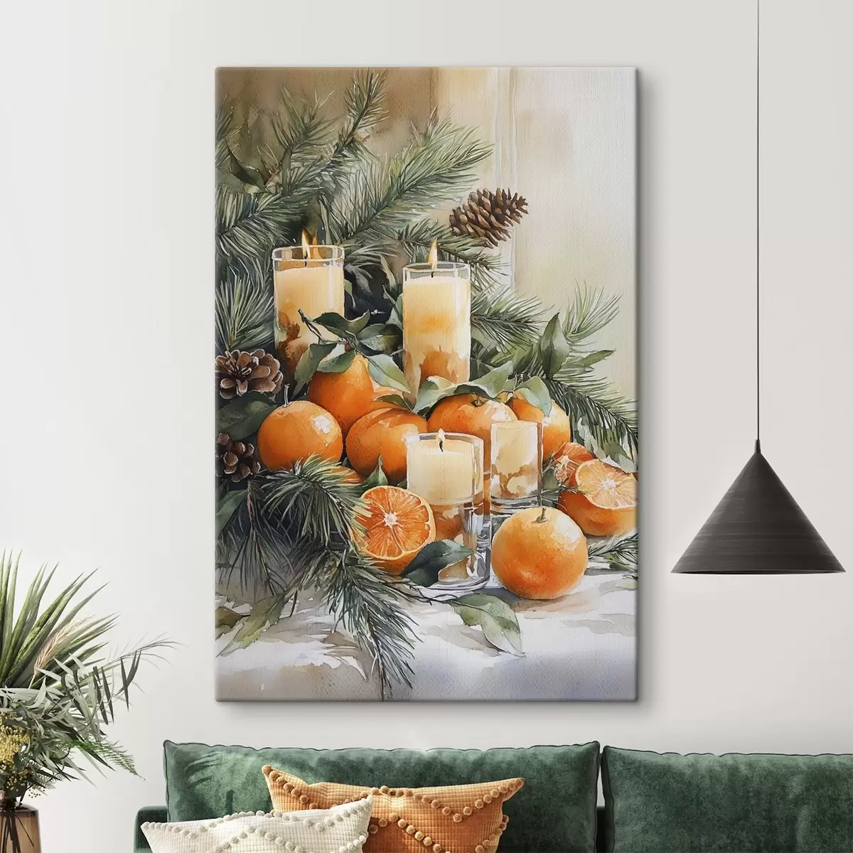 Gemälde Tannenzweige mit Zapfen, Orangen und Kerzen, festlich, Aquarellstil Art. s41956