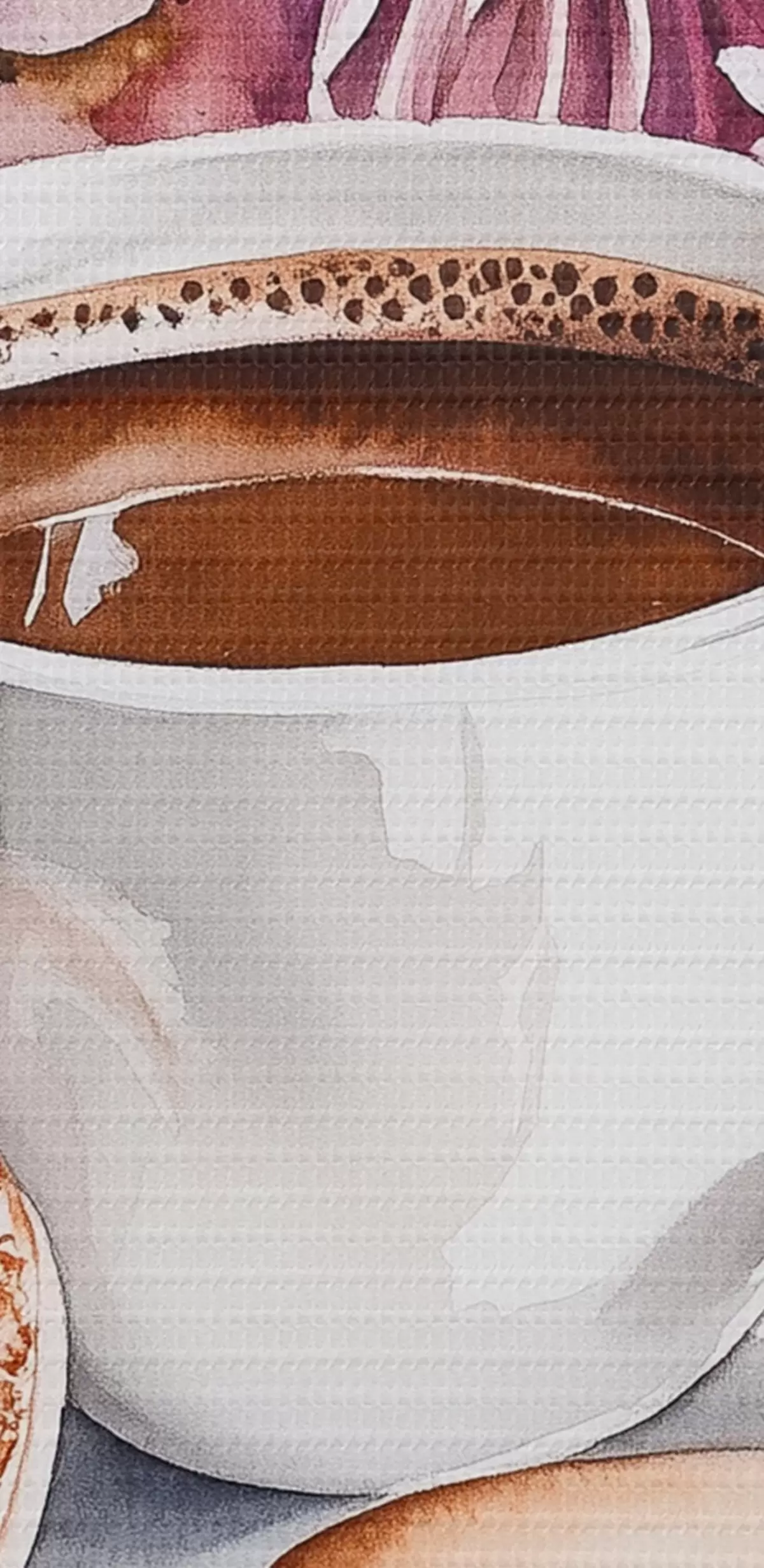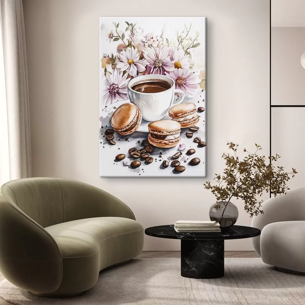 Gemälde Tasse Kaffee mit Makronen, rosa Blumen, Aquarell-Stil, Kaffeebohnen Art. s41963