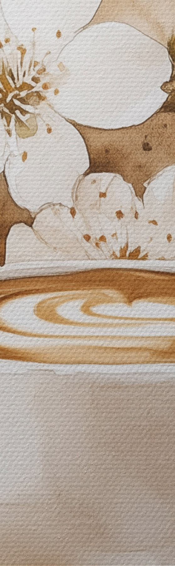 Gemälde Makronen, Tasse Kaffee, Aquarellstil, Beigetöne, Jasminblüten Art. s41965