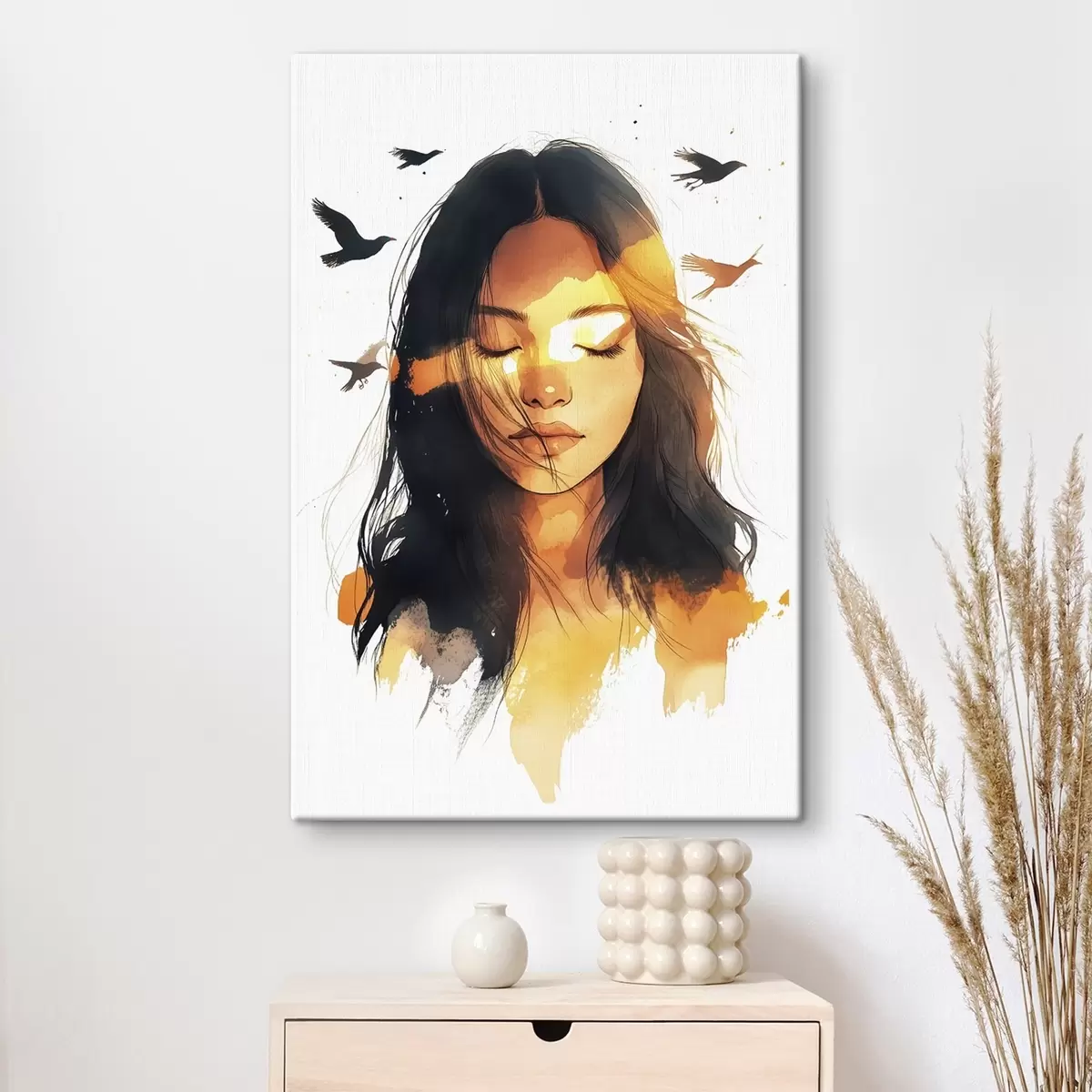 Gemälde Aquarell-Stil Porträt, schönes Mädchen, Sonnenlicht, fliegende Vögel Art. s42198