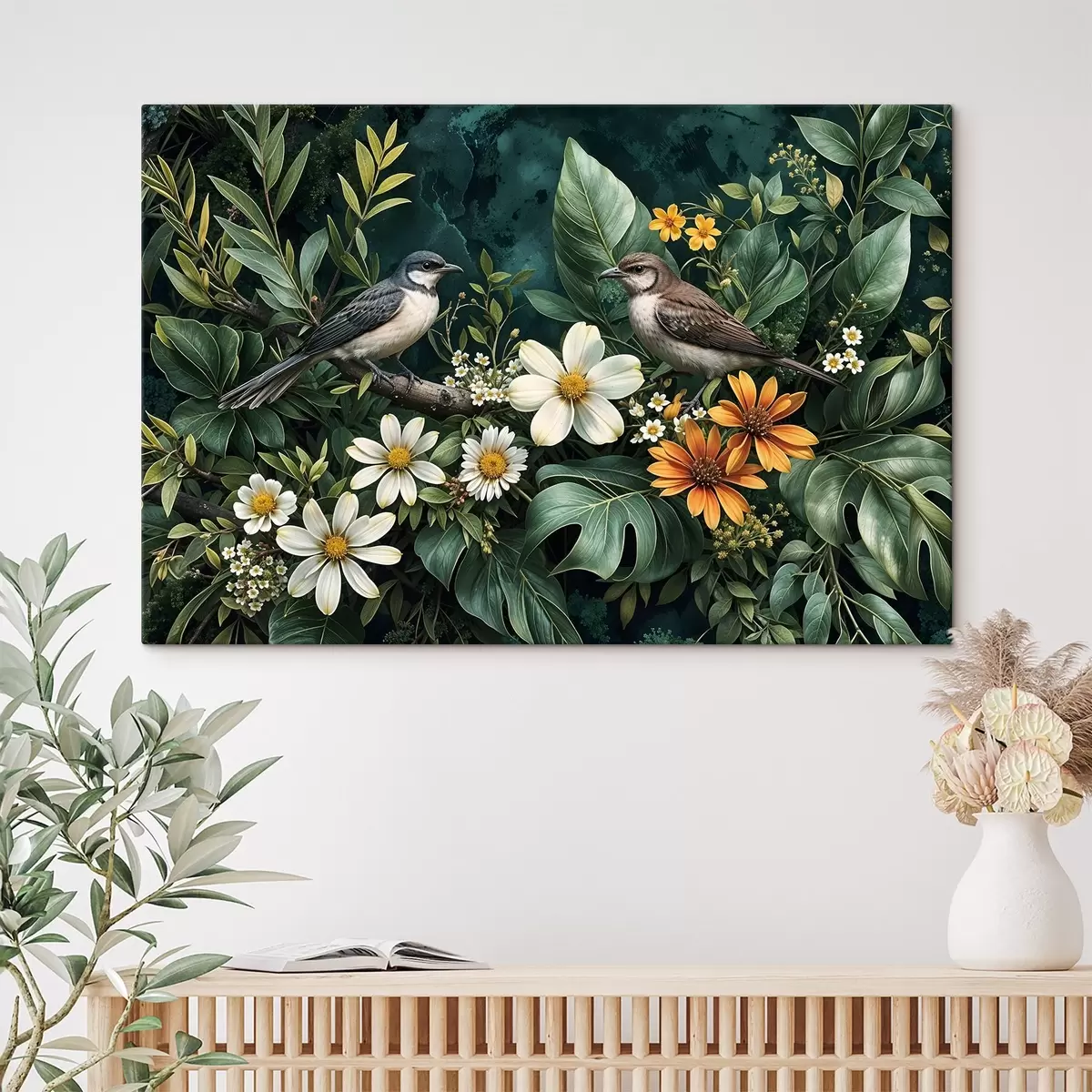 Gemälde Kleine Vögel sitzen auf Zweigen, umgeben von üppigem tropischen Laub, darunter große grüne Blätter und bunte Blumen Art. s42220