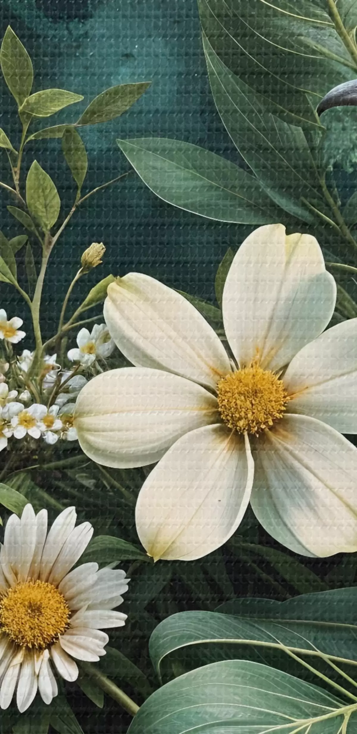 Fototapete Kleine Vögel sitzen auf Zweigen, umgeben von üppigem tropischen Laub, darunter große grüne Blätter und bunte Blumen s42220