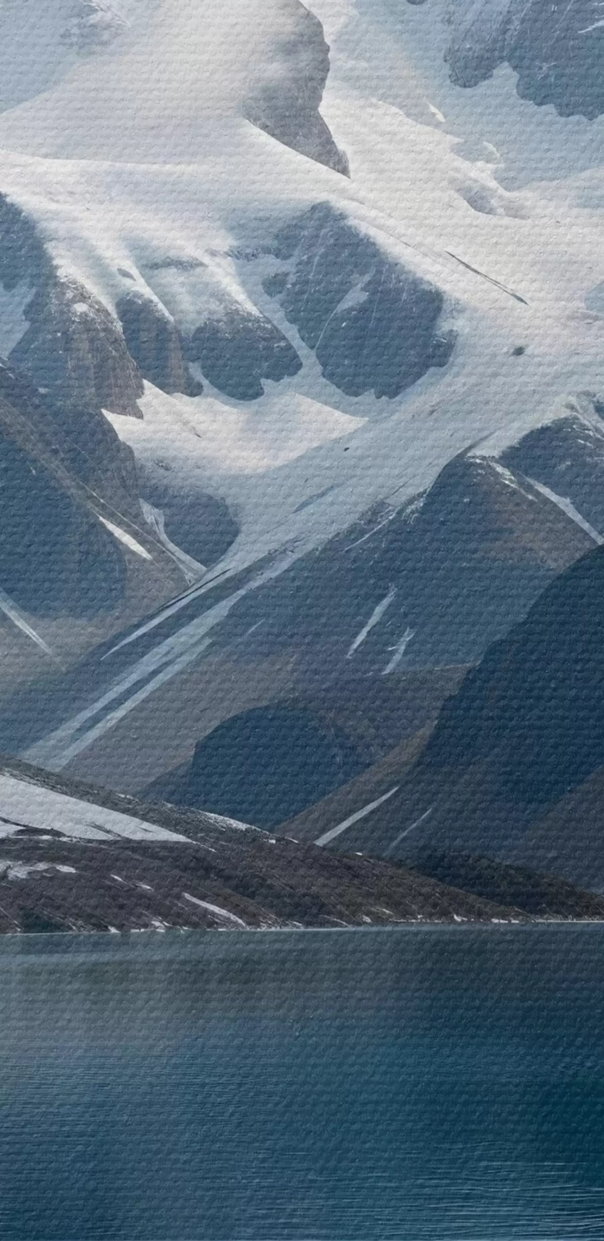 Fototapete Ein schneebedeckter Berggipfel, der sich in einem ruhigen türkisfarbenen See spiegelt, umgeben von felsigem Gelände und dramatischen Wolken s42232