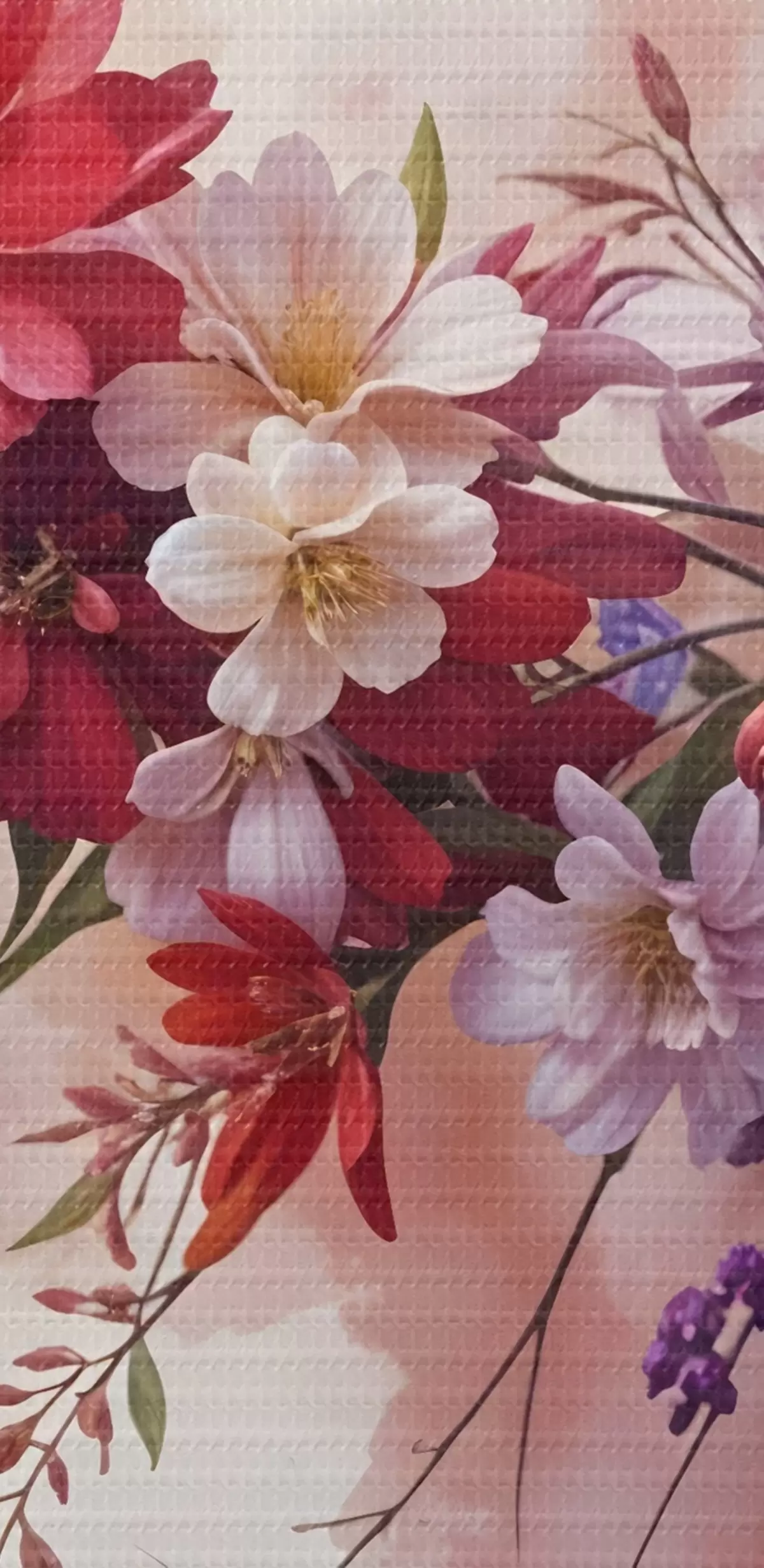 Fototapete Bunte Blumen, darunter rote, rosa und lila Dahlien, Gänseblümchen und andere Blüten vor einem weichen, unscharfen Hintergrund  s42234