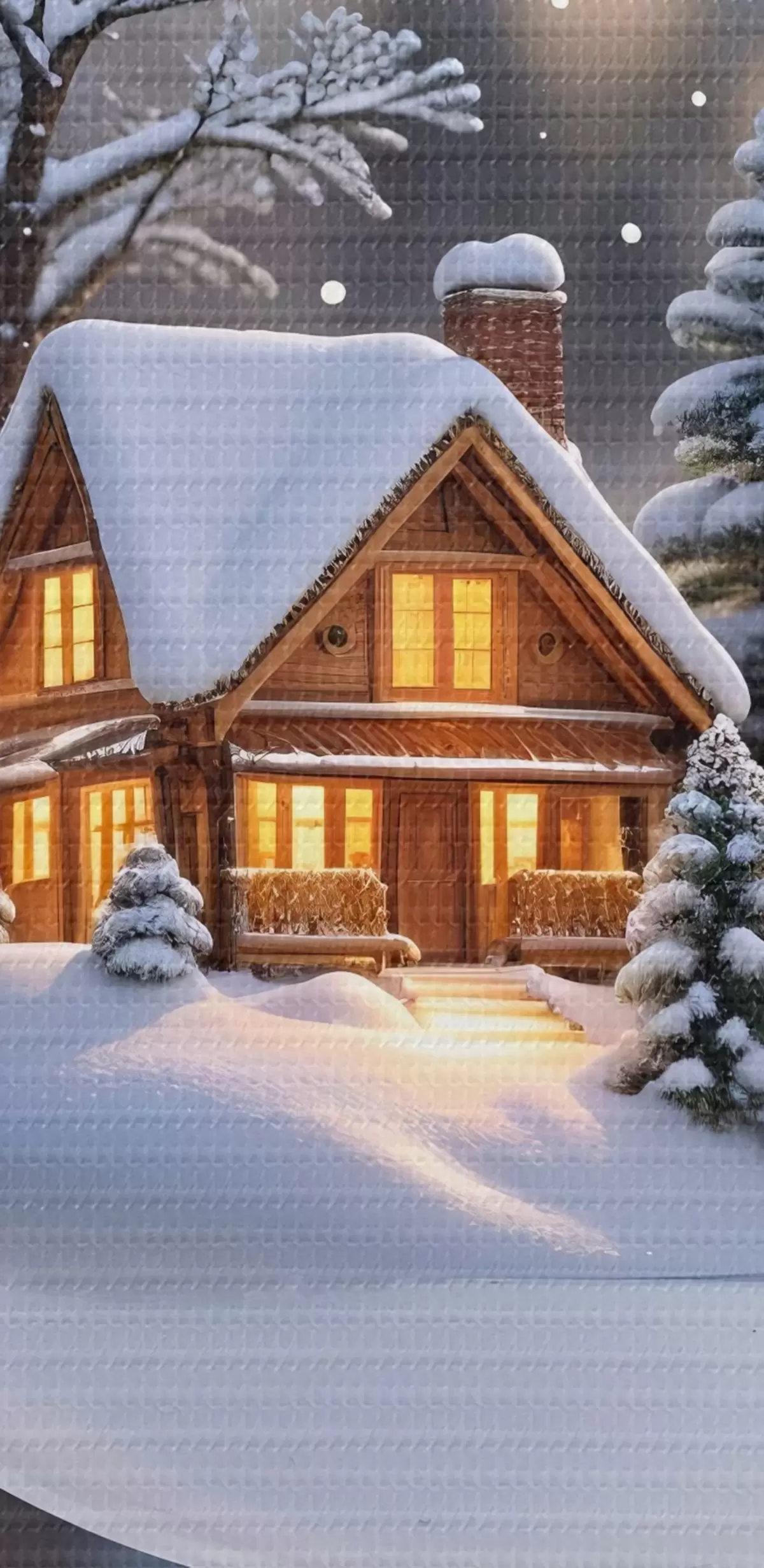 Fototapete Eine gläserne Weihnachtskugel mit einer verschneiten Winterlandschaft im Inneren, die eine gemütliche Hütte im Wald mit Tannenbäumen zeigt s42236
