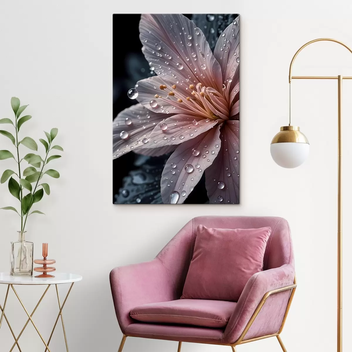Gemälde Nahaufnahme einer rosafarbenen Blume mit zarten Blütenblättern, die mit Wassertropfen bedeckt sind, vor einem dunklen Hintergrund Art. s42237