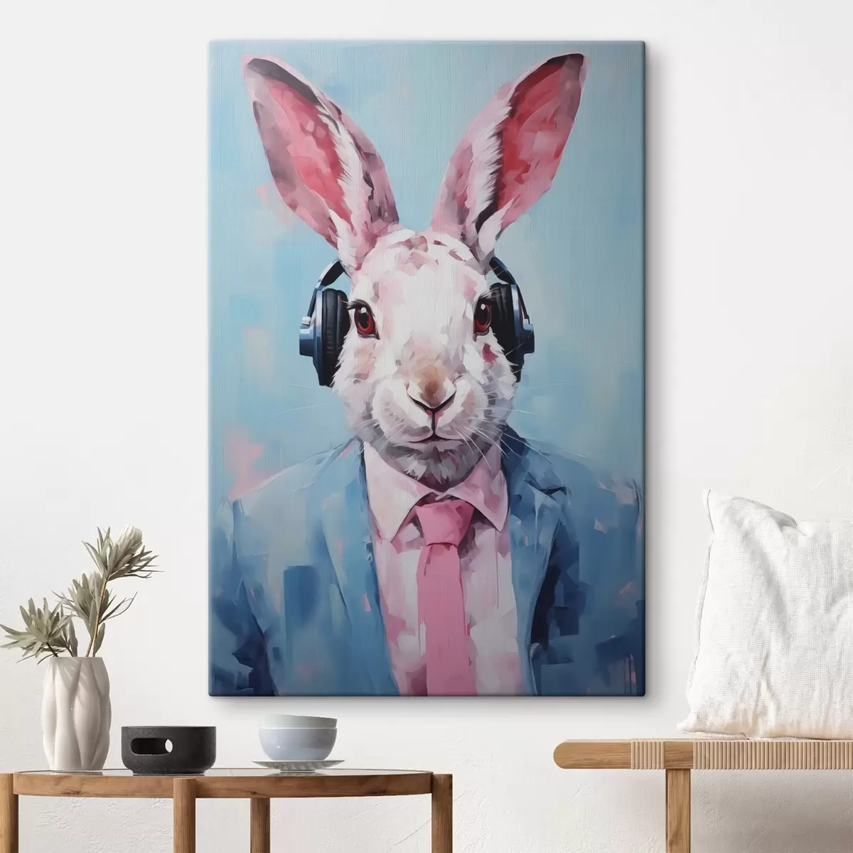 Gemälde Kaninchen mit Kopfhörern in einer blauen Jacke Nachahmung der Malerei Art. s42365