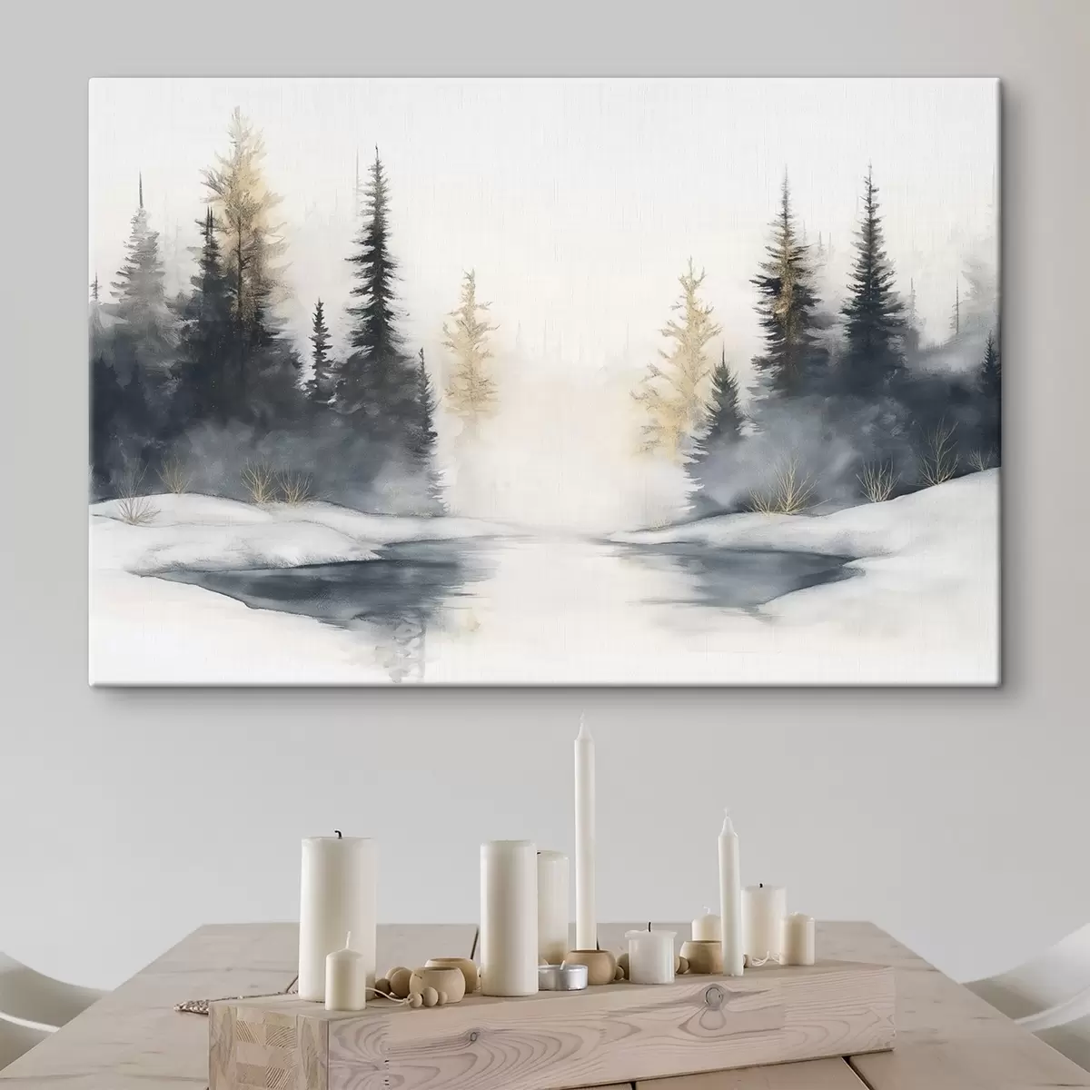 Gemälde Winterlandschaft mit Fluss und Kiefern, Natur, Wald, Nebel Art. s42374