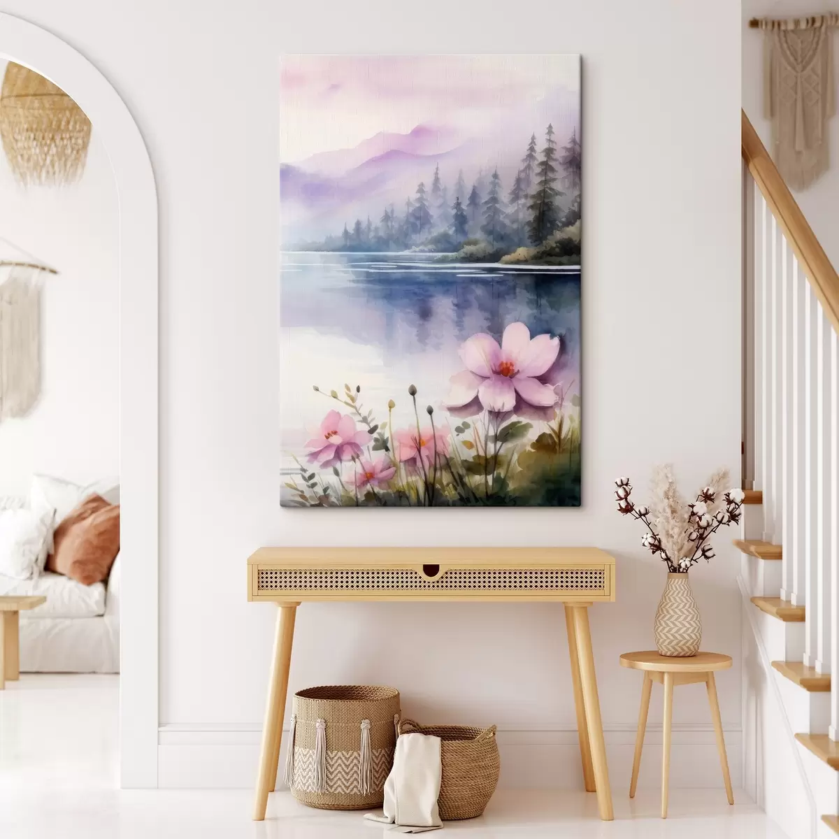 Gemälde Rosa Blumen vor der Kulisse eines Bergsees Art. s42393