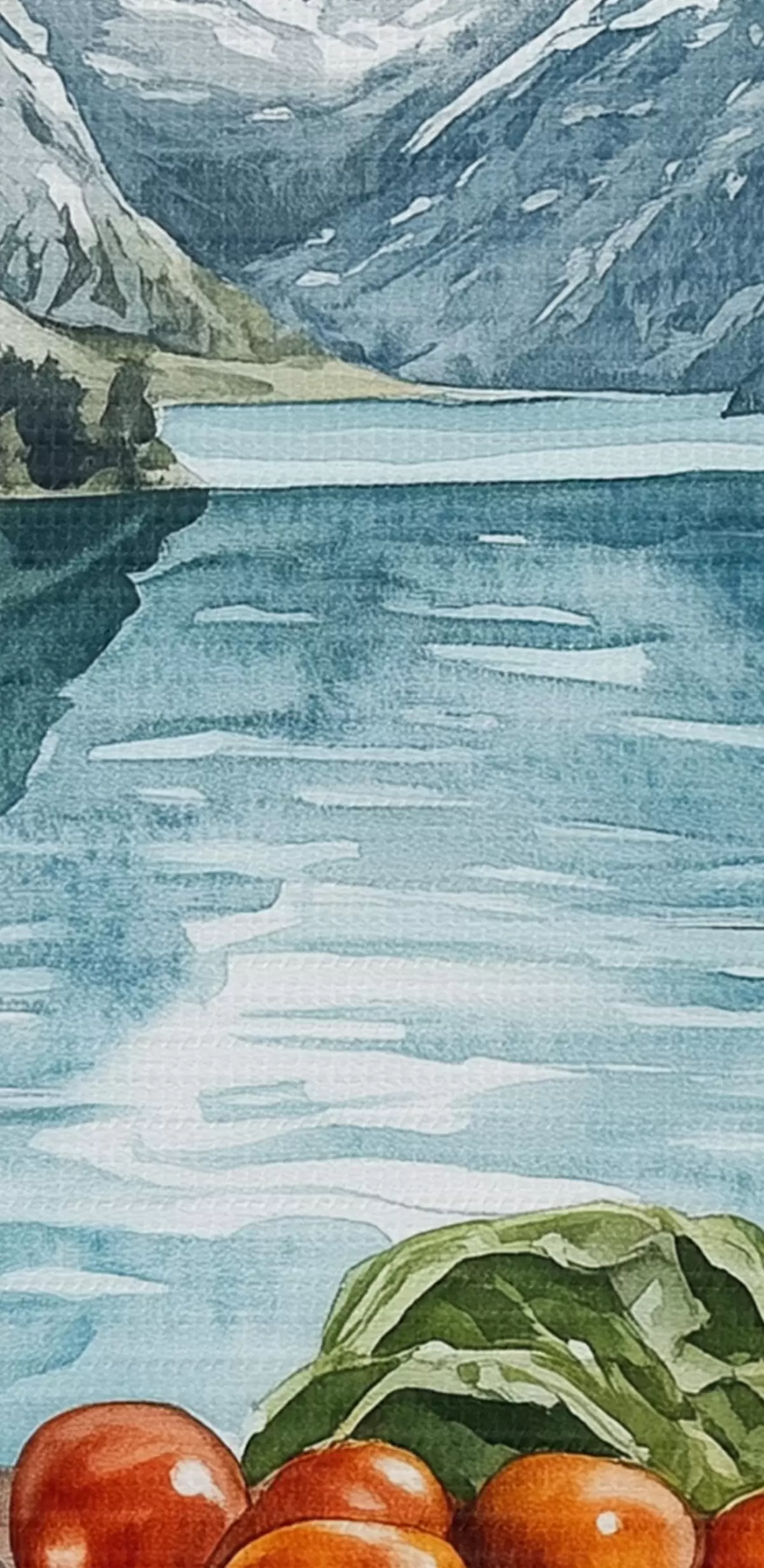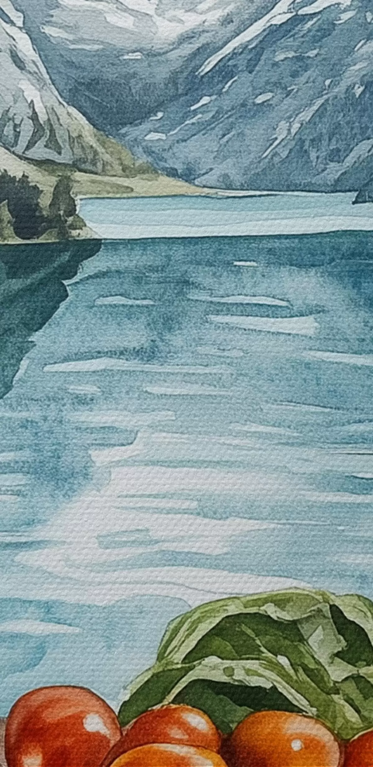 Gemälde Reisen, Naturlandschaften, Aquarellstil, Norwegen, Frühstück, Van Art. s42431