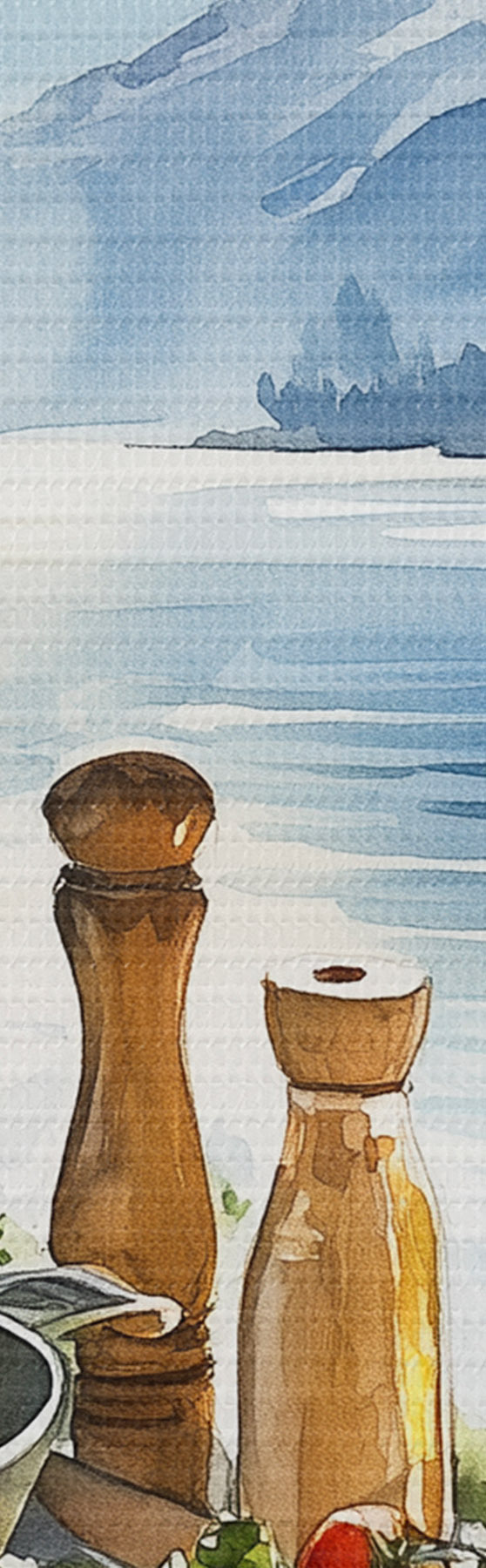 Gemälde Schöner Sommermorgen, See, Aquarellstil, Frühstück, Reisen Art. s42433
