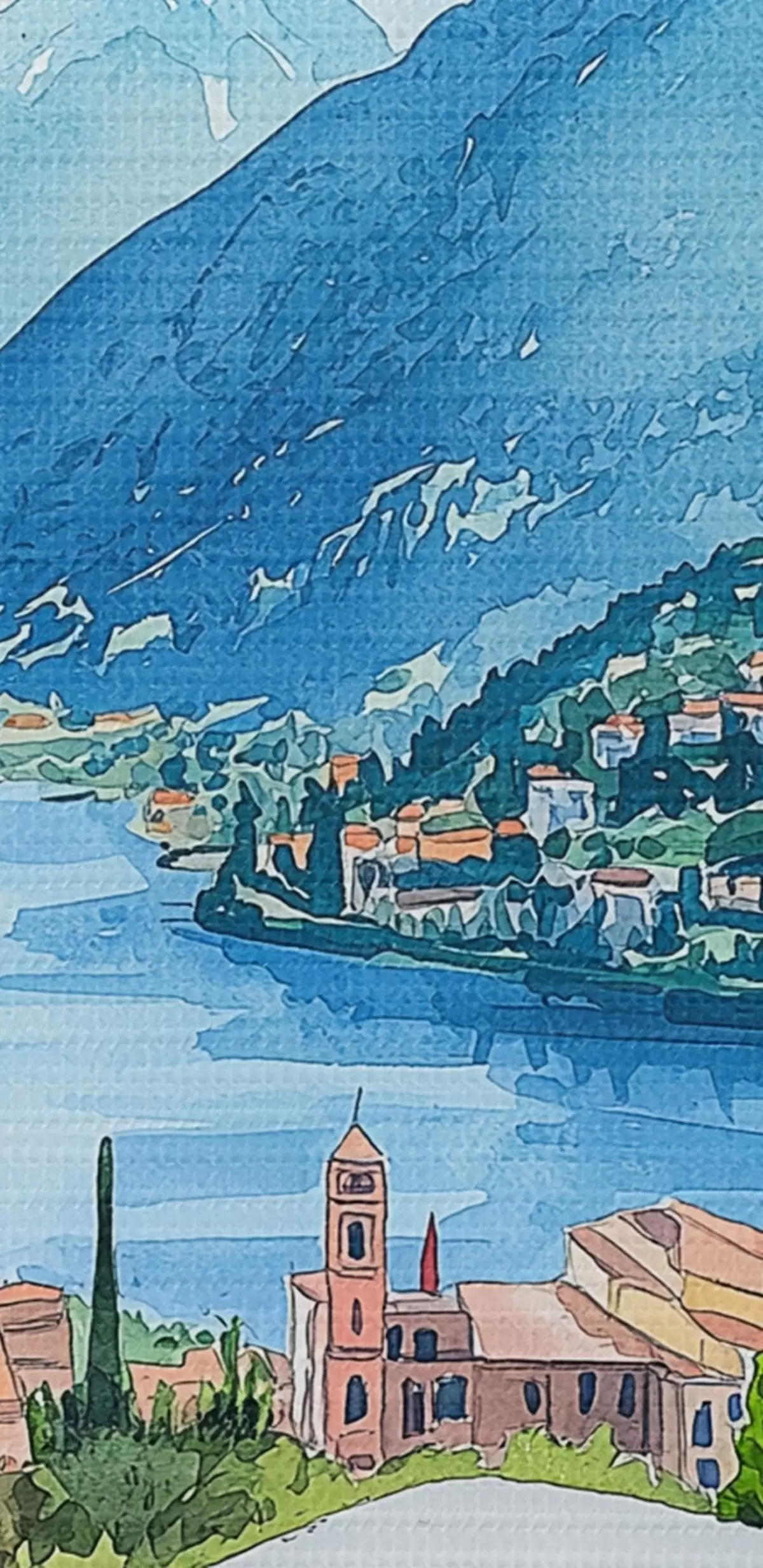 Gemälde Aquarell-Stil, Italien, Pizza, alte Stadt, Berge Landschaft Art. s42435