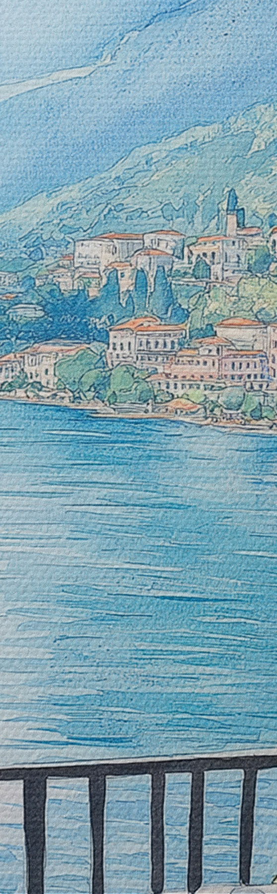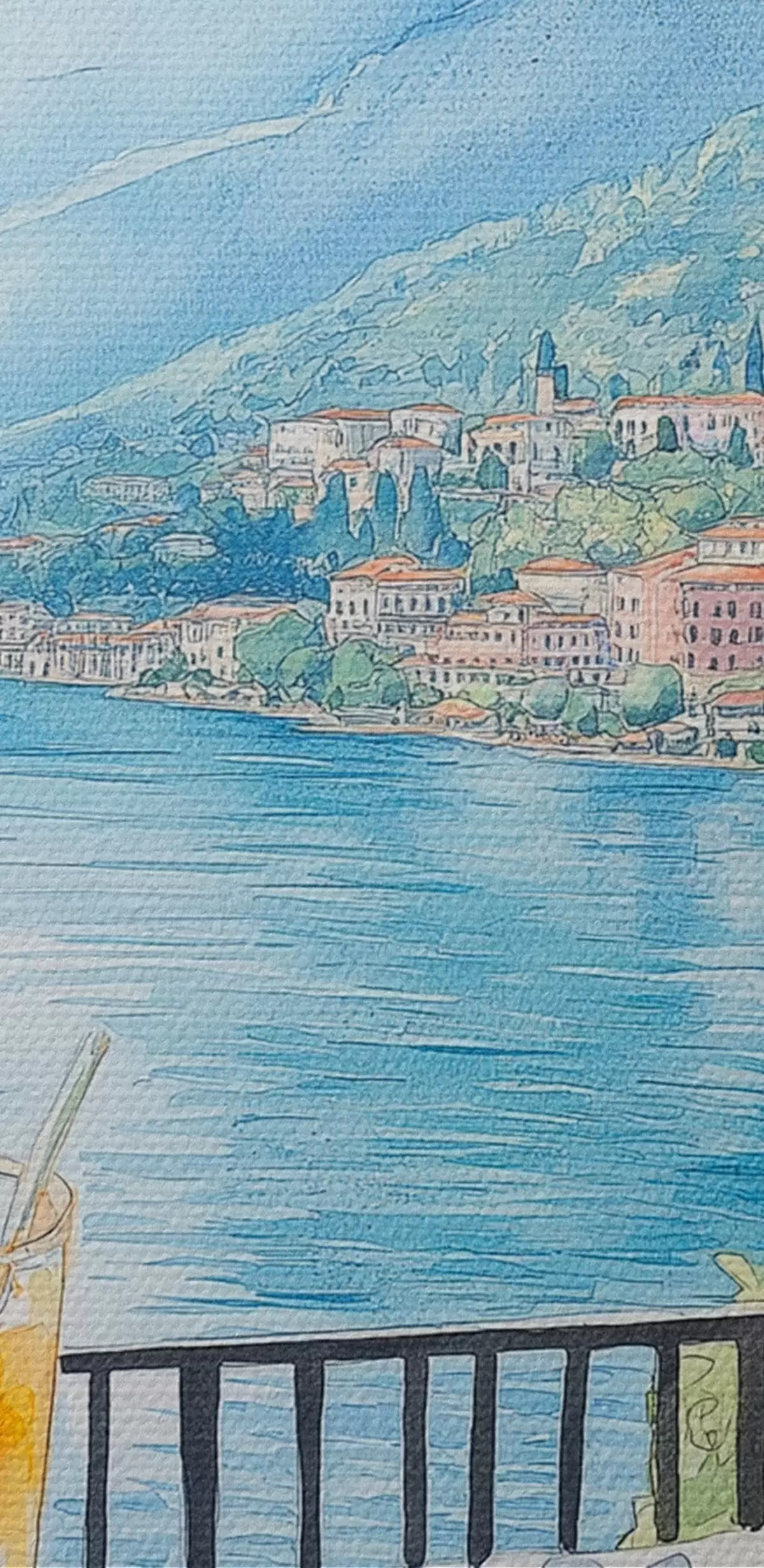 Gemälde Brunch in Italien, Aquarellstil, Pizza Margarita, See, Sommer Natur Art. s42436