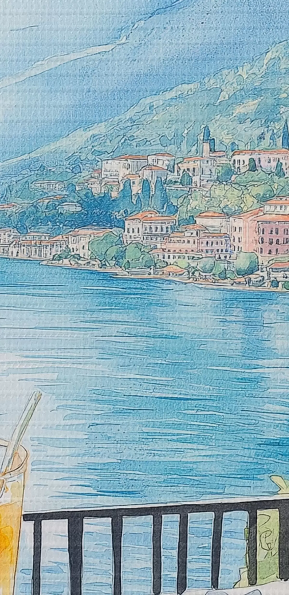 Fototapete Brunch in Italien, Aquarellstil, Pizza Margarita, See, Sommer Natur s42436