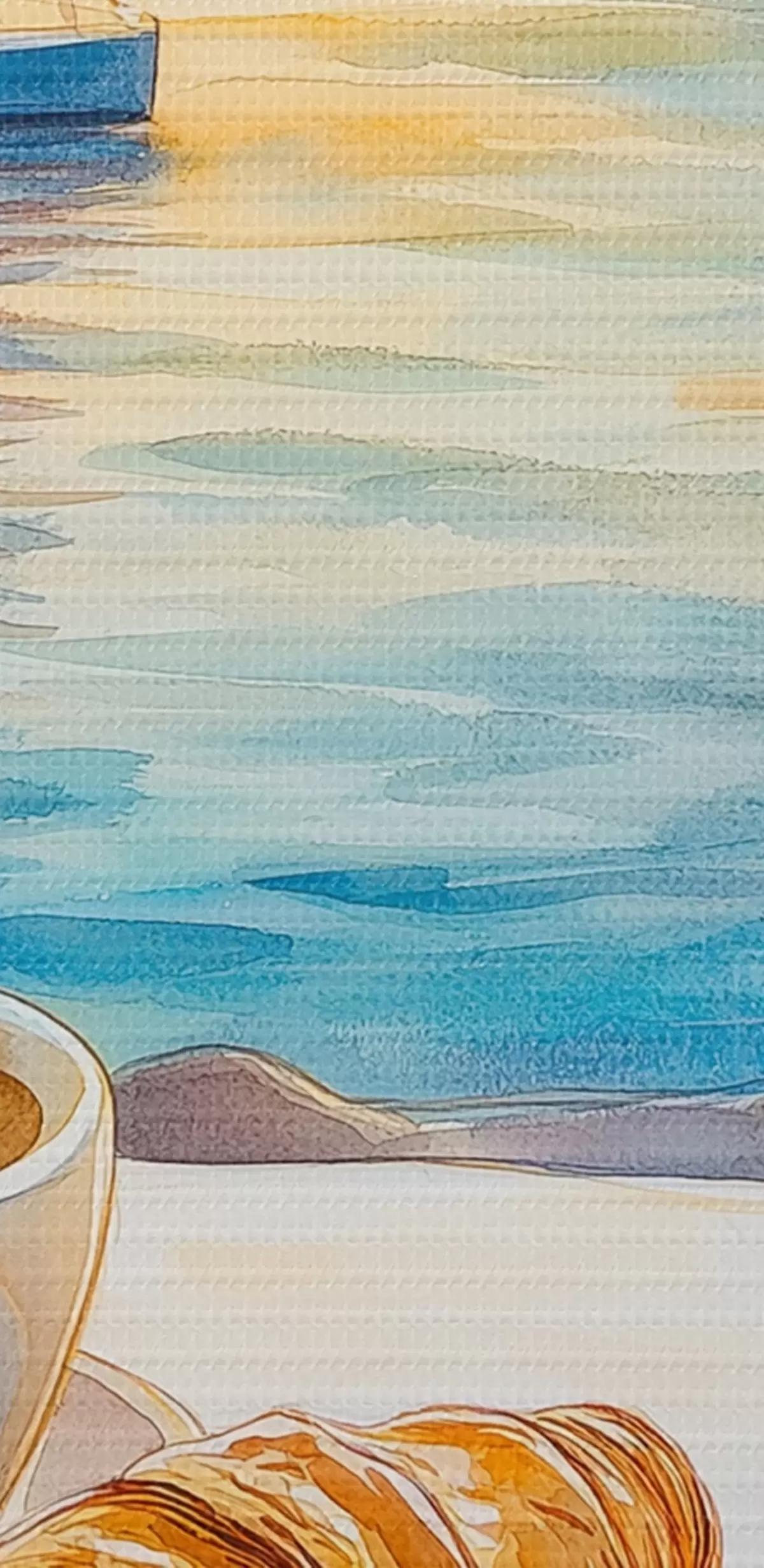 Fototapete Zwei Tassen Cappuccino, Aquarell-Stil, Meer Sonnenuntergang, Segelboote, Berufung s42438