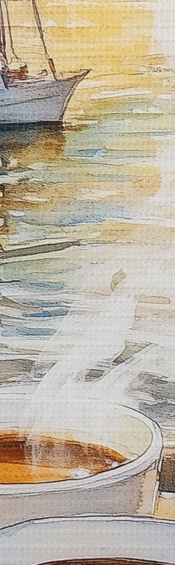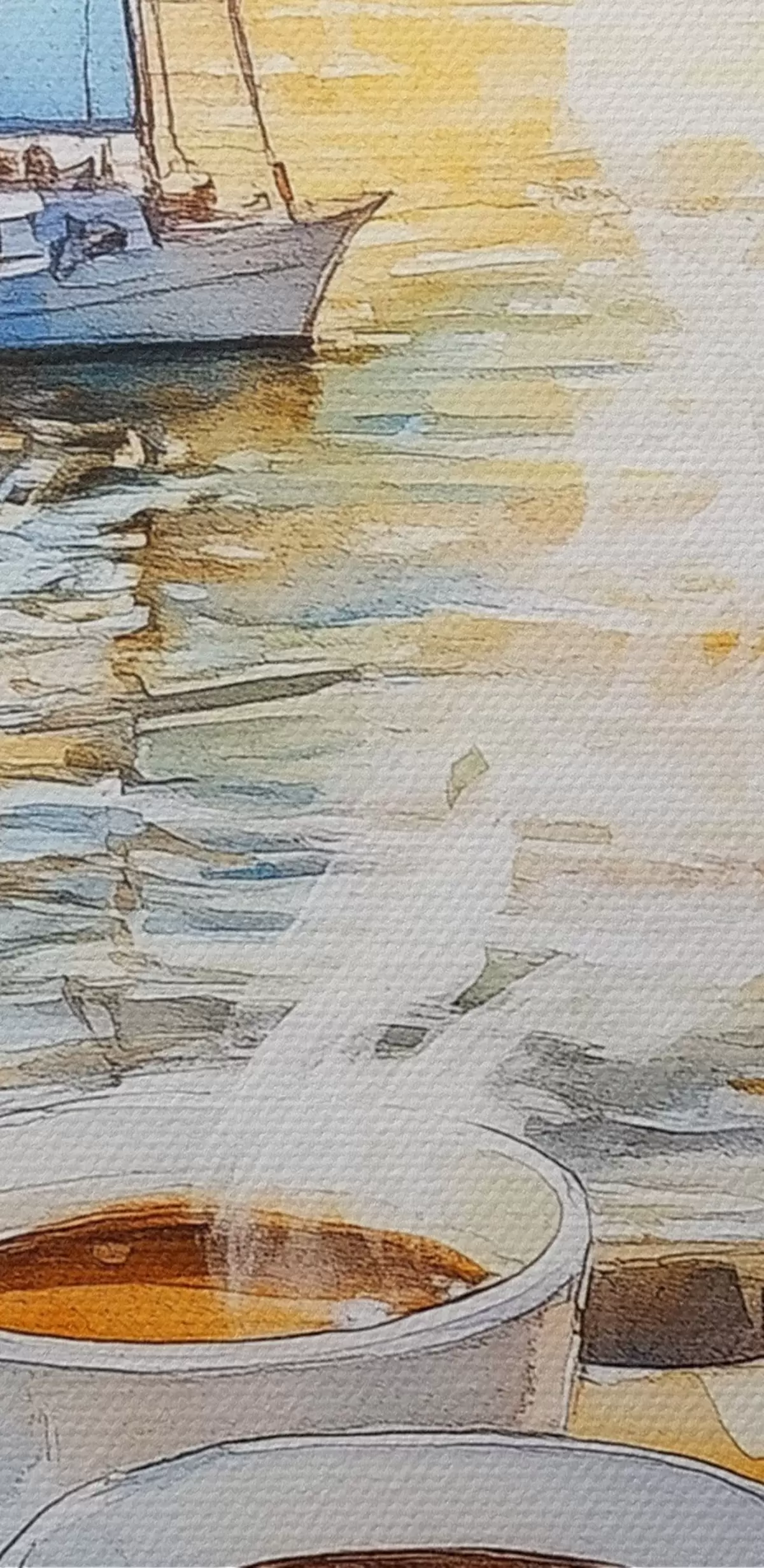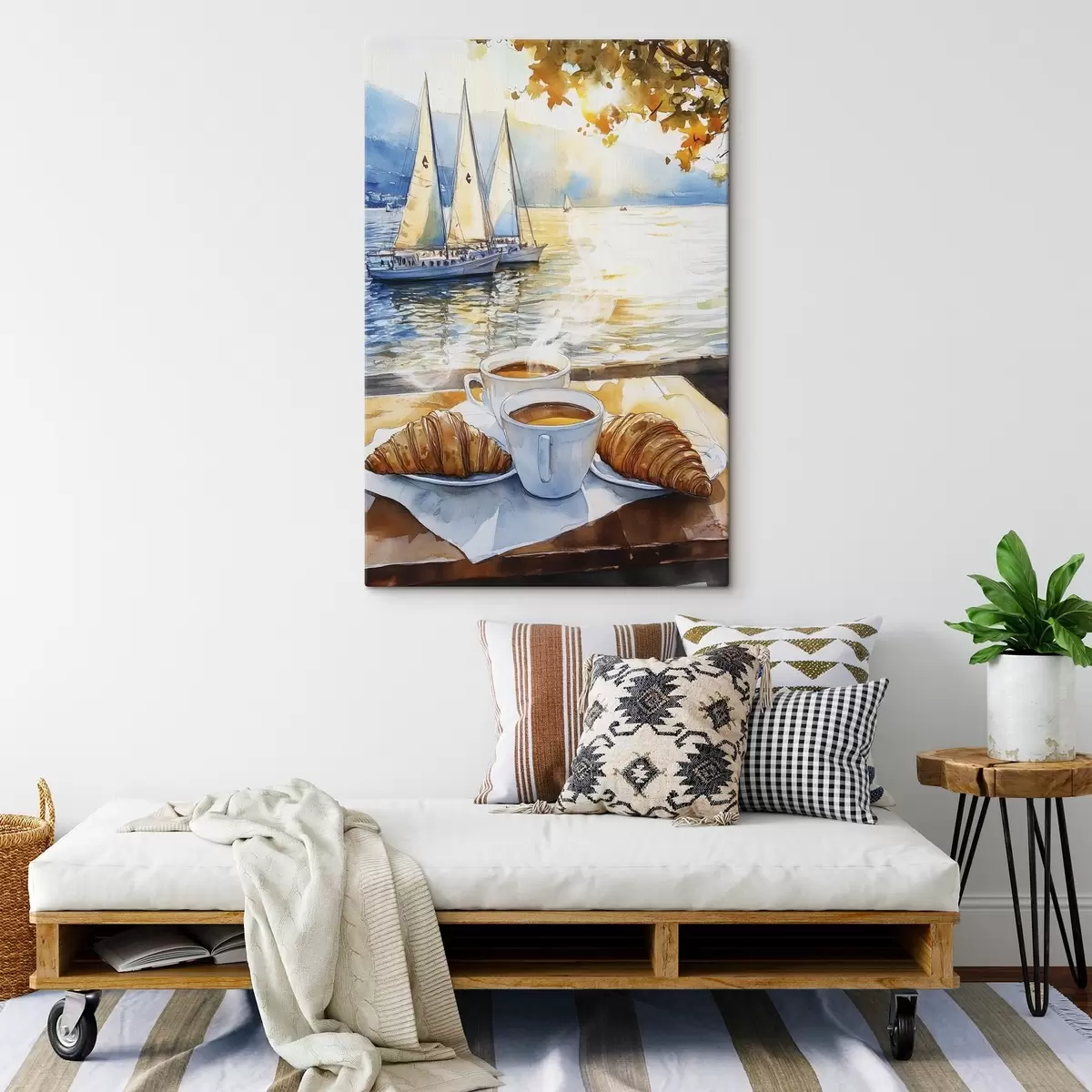 Gemälde Tassen Kaffee, Sonnenuntergang Farben, See, Segelboote, Natur, Reisen Art. s42443