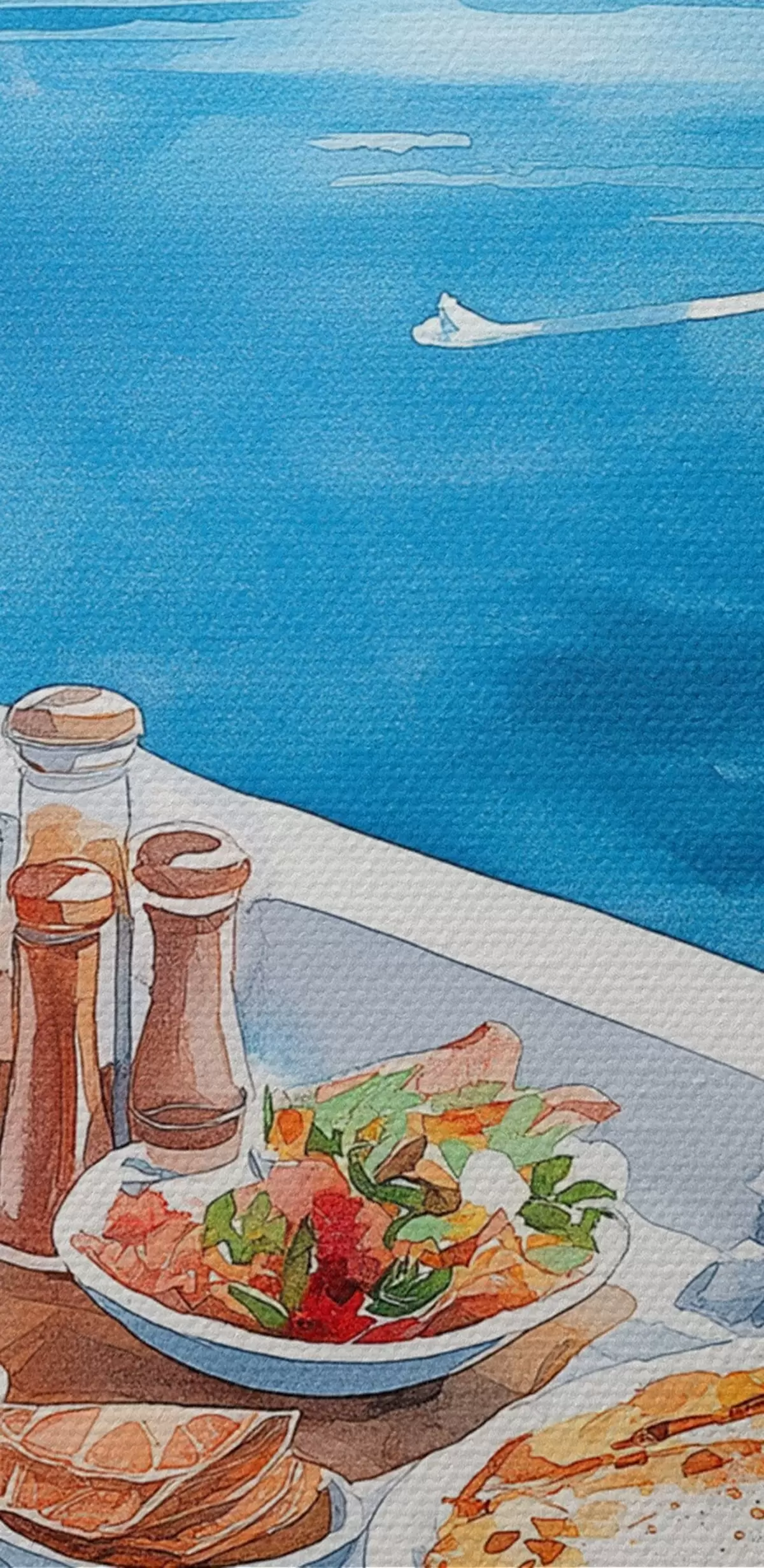 Gemälde Schönes romantisches Frühstück in Griechenland, Meer, Aquarellstil Art. s42455