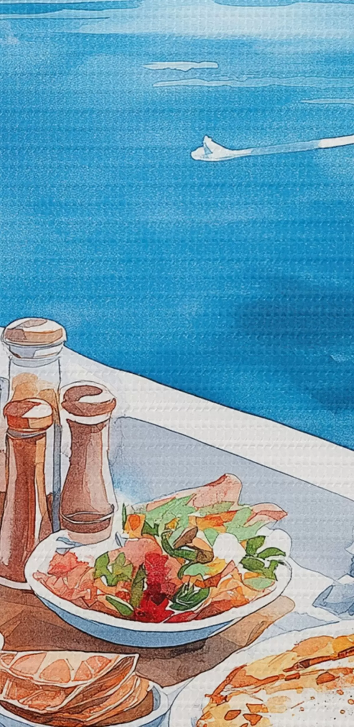 Fototapete Schönes romantisches Frühstück in Griechenland, Meer, Aquarellstil s42455