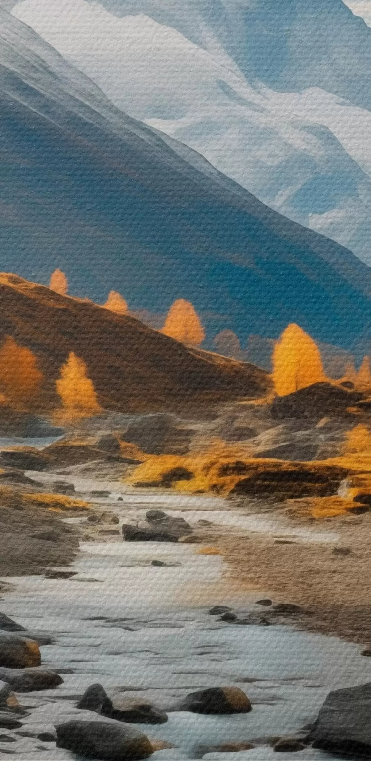 Gemälde Herbstliche Berglandschaft mit einem reißenden Fluss, Bäumen und einem majestätischen Gipfel vor dem Hintergrund eines klaren Himmels. Art. s42564