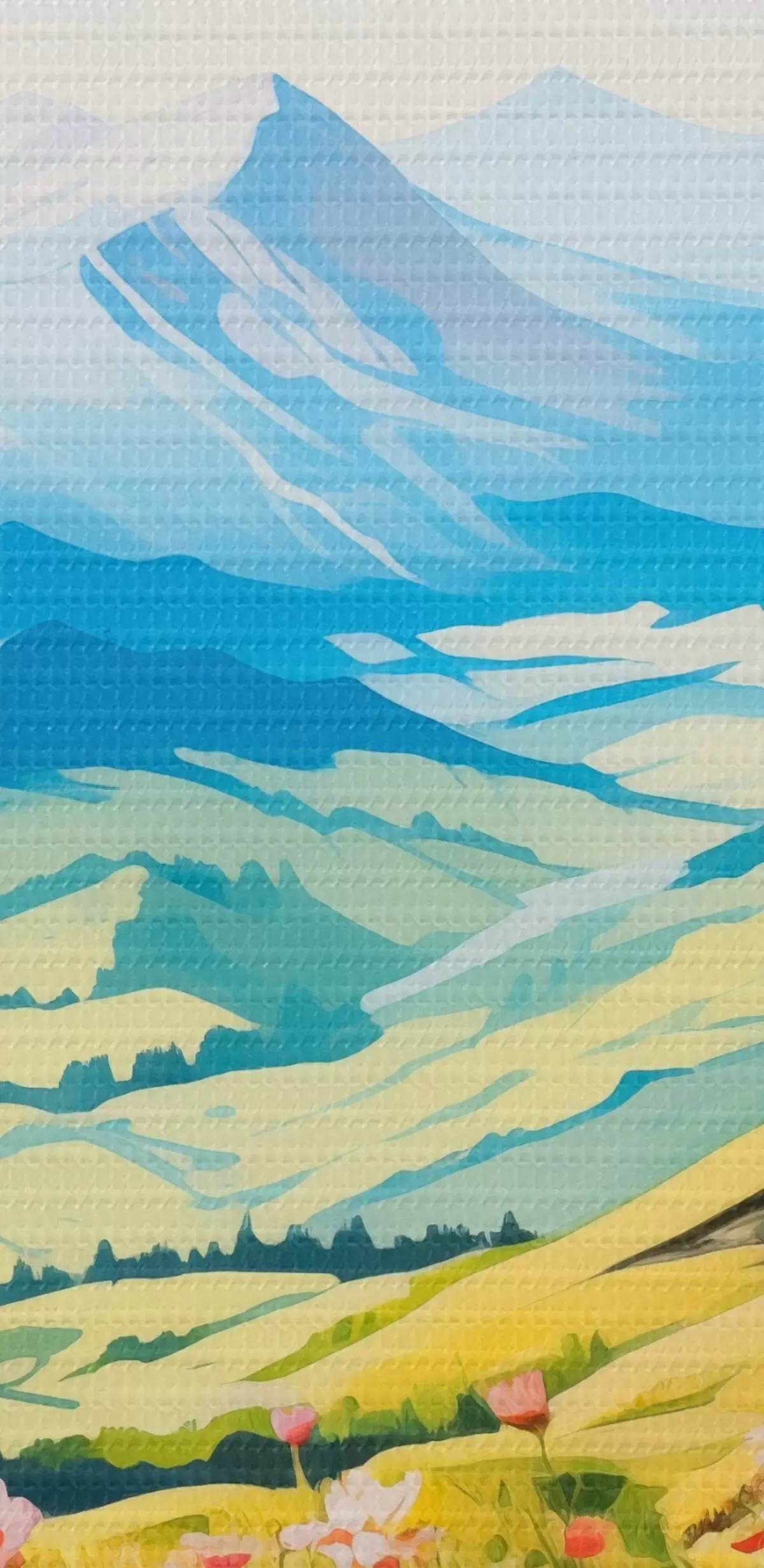 Gemälde Eine lebendige Berglandschaft mit blühenden Wiesen, grünen Hügeln und majestätischen Gipfeln unter einem strahlend blauen Himmel. Art. s42565