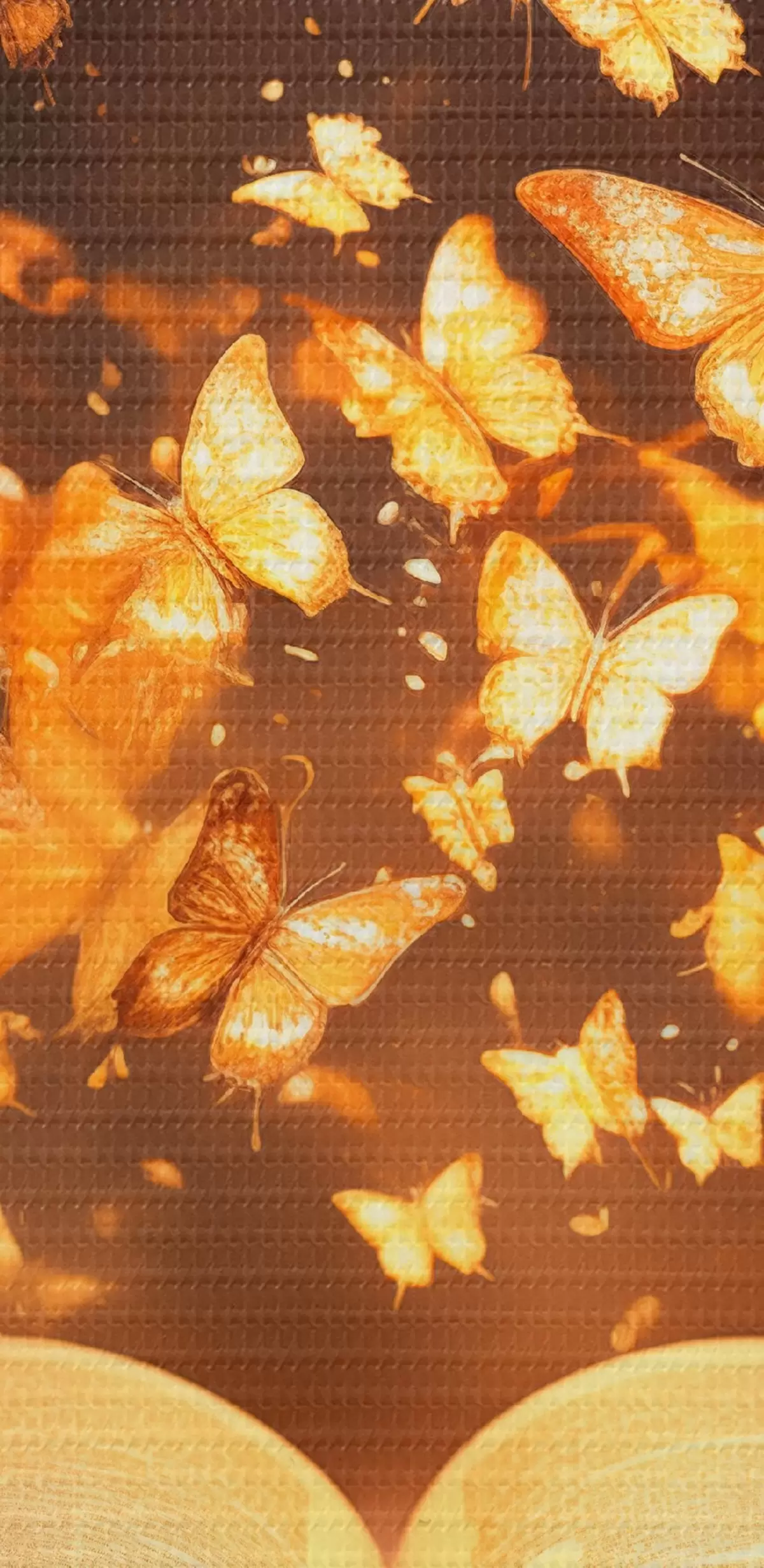 Fototapete Ein aufgeschlagenes Buch, aus dem leuchtende Schmetterlinge auftauchen, die in Lichtstrahlen in einem dunklen, magischen Wald leuchten. s42573