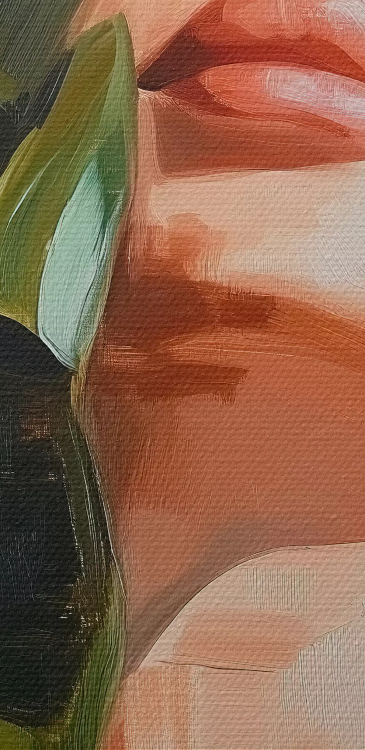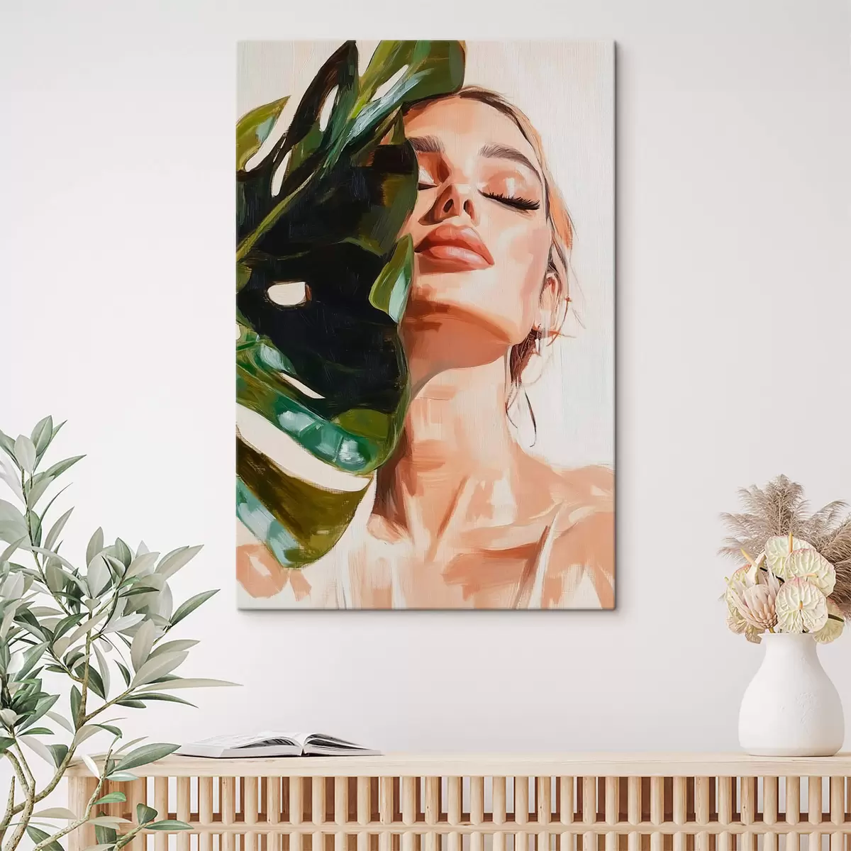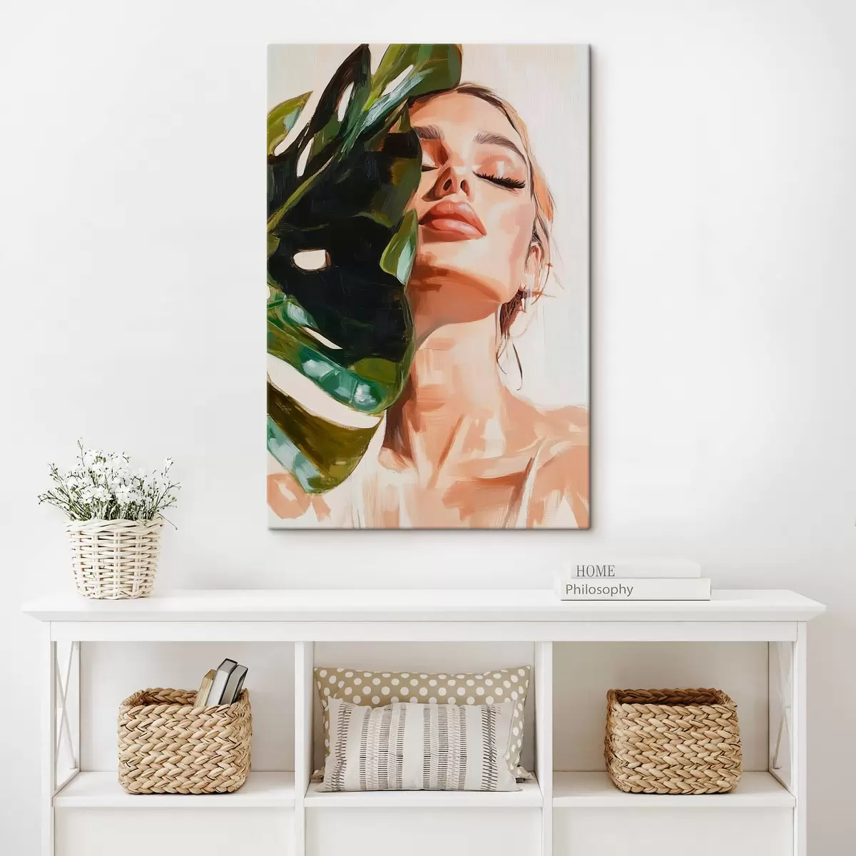 Gemälde Porträt einer Frau mit einem Monstera-Blatt mit nachgeahmten Pinselstrichen Art. s42597