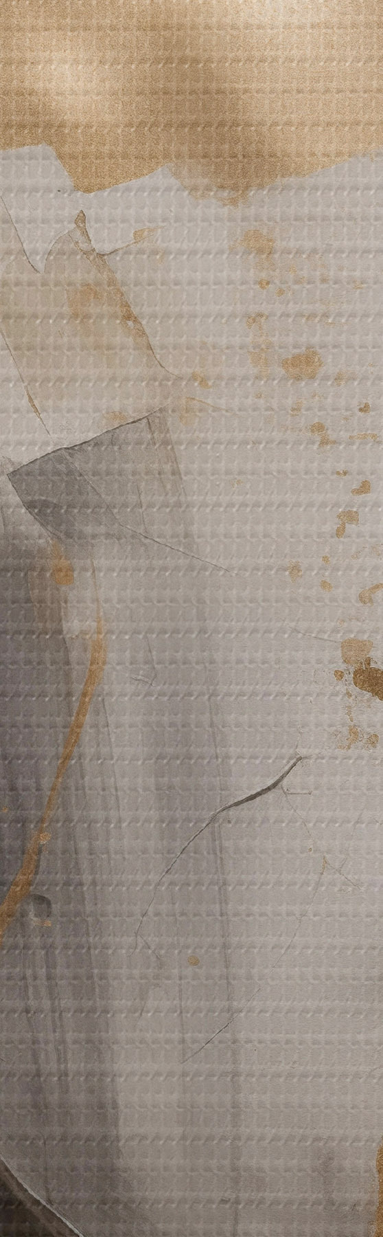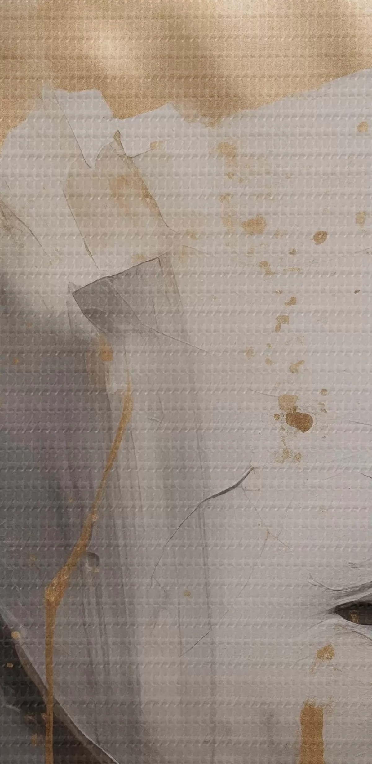 Fototapete Abstraktes Porträt einer Frau mit Betonung auf geschlossenen Augen und Lippen, ausgeführt in Schwarz-Weiß-Tönen mit dynamischen, warmfarbigen Pinselstrichen. s42626