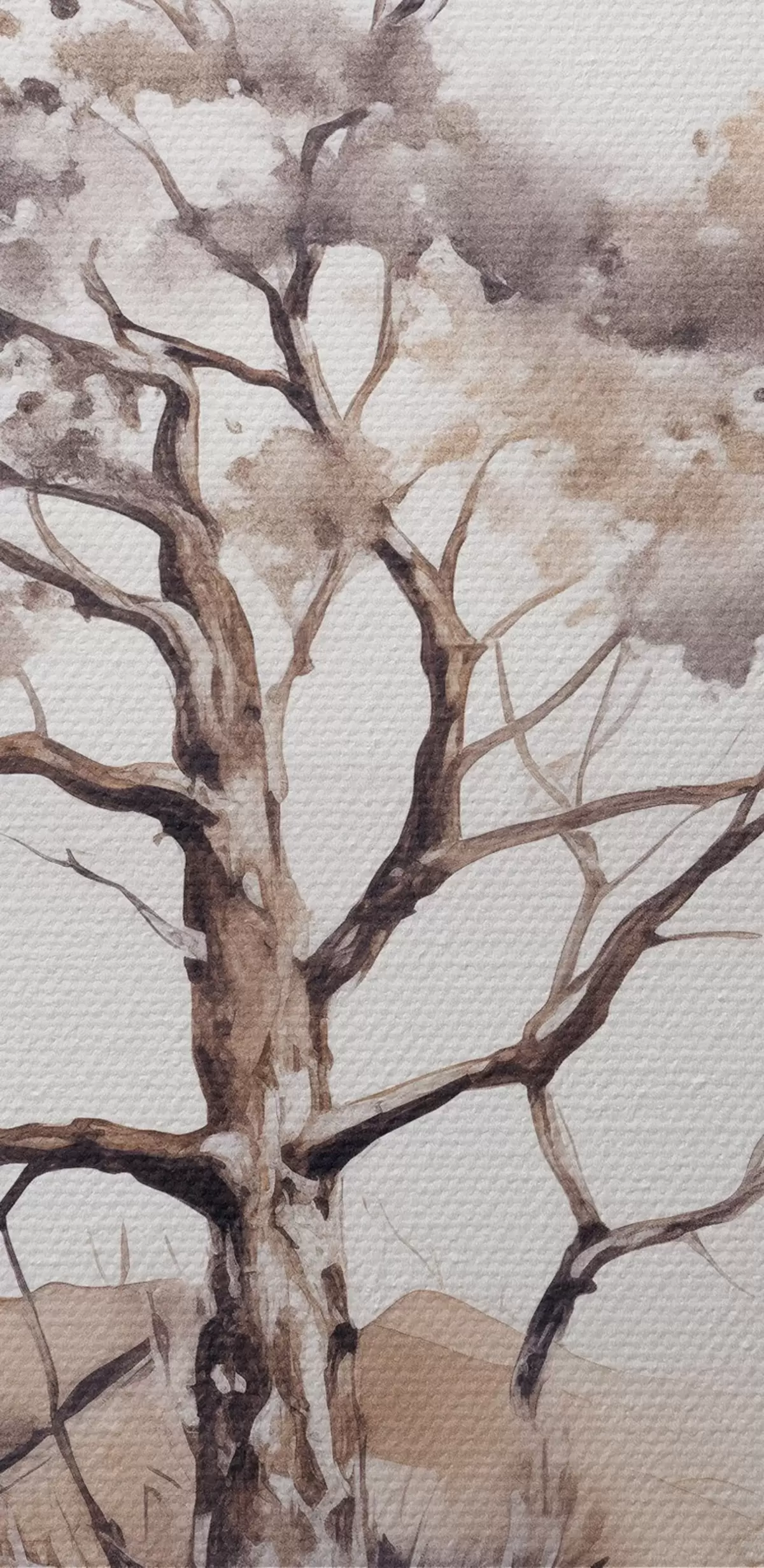 Gemälde Ein einsamer Baum mit verdrehtem Stamm und spärlichen Ästen vor einem sanften, gedämpften Hintergrund aus Bergen Art. s42715