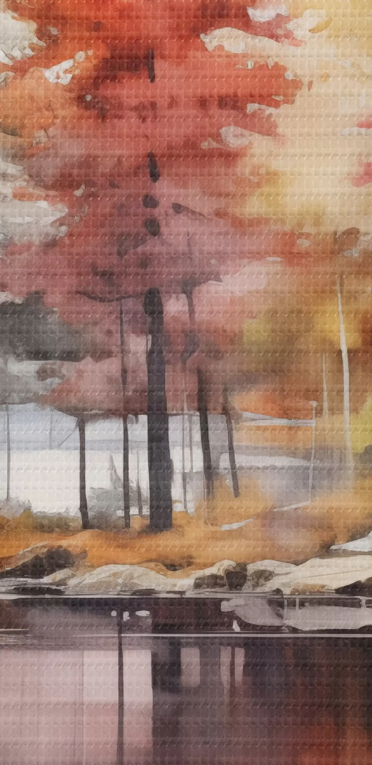 Fototapete Aquarellartige Landschaft mit einem See, umgeben von Bäumen in leuchtenden Herbstfarben s42727