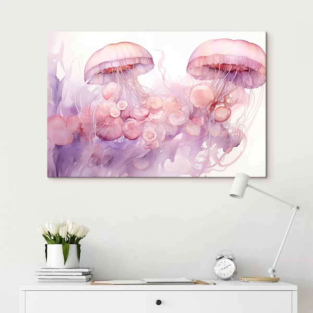 Gemälde Rosa Quallen, die in einem Strudel aus zarten rosa und lila Tönen schwimmen, umgeben von abstrakten Formen Art. s42730