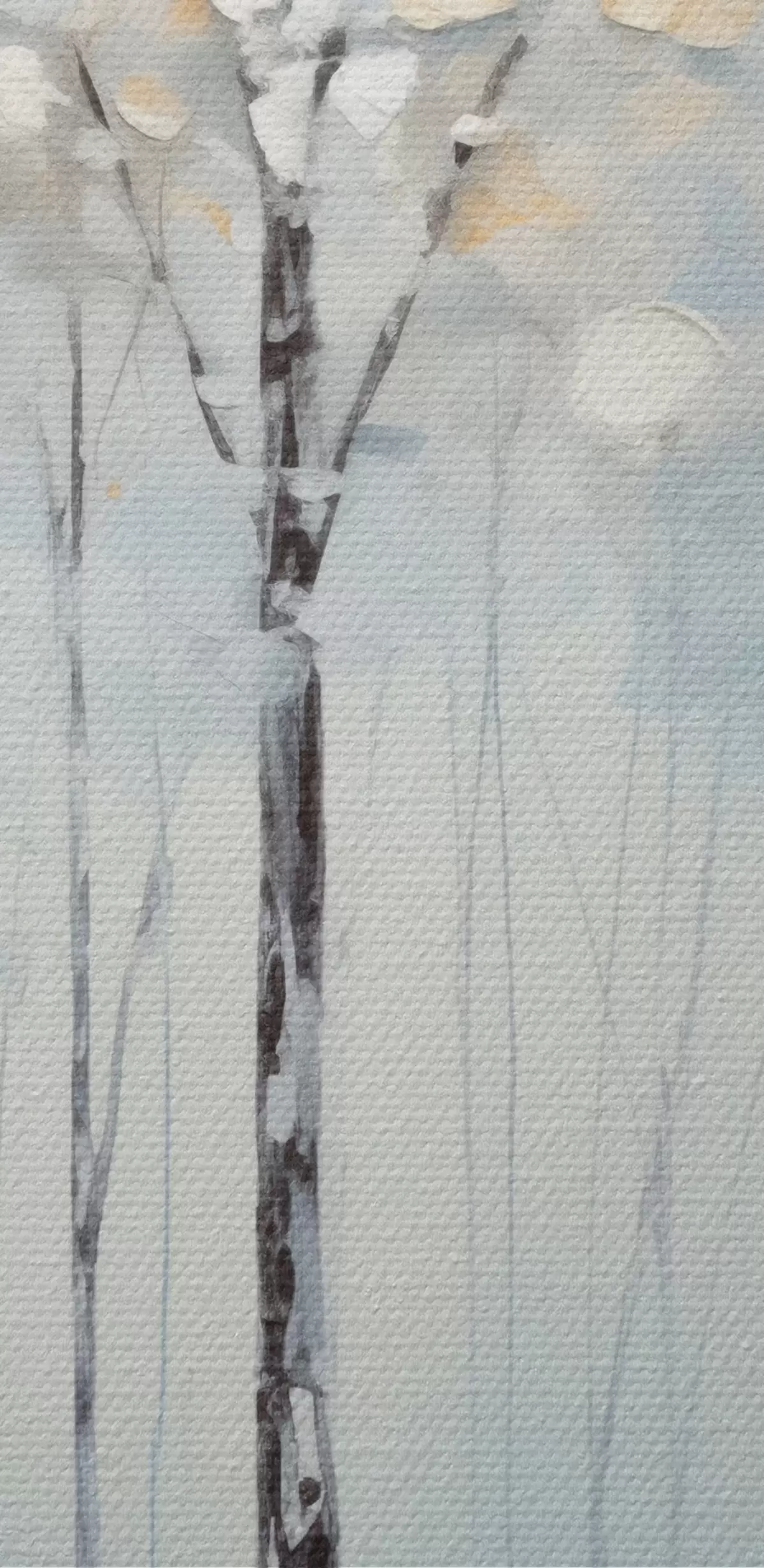 Fototapete Hohe, schlanke Bäume mit blauen Blättern und einem Hauch von Gelb auf einem weichen blauen Hintergrund, Ölgemälde-Imitation s42731