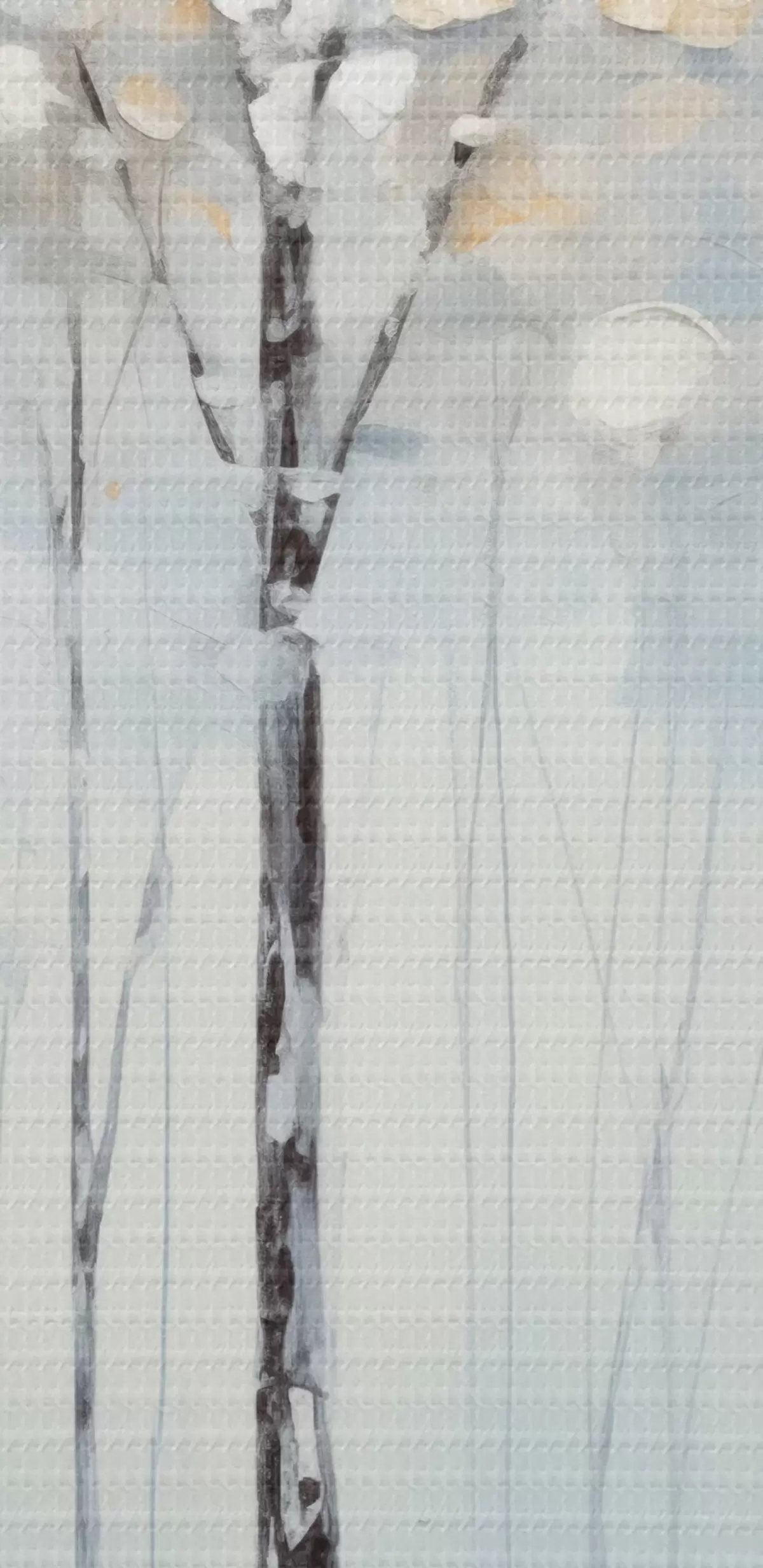 Gemälde Hohe, schlanke Bäume mit blauen Blättern und einem Hauch von Gelb auf einem weichen blauen Hintergrund, Ölgemälde-Imitation Art. s42731