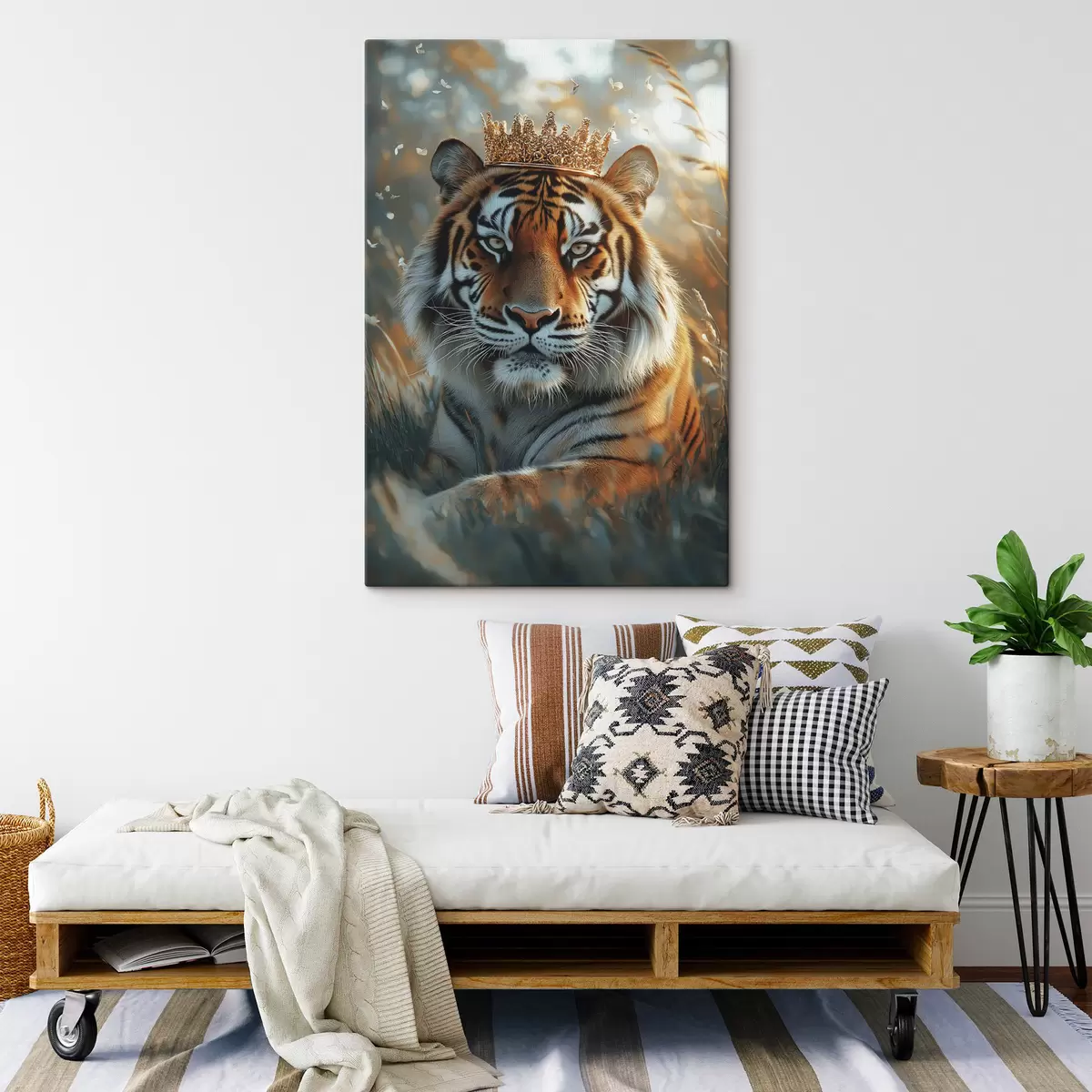 Gemälde Ein wunderschöner Tiger mit einer Krone, eine Sommerwiese, Realismus Art. s42786