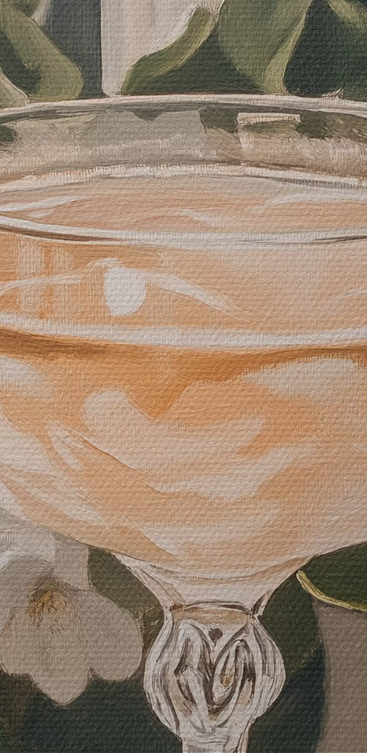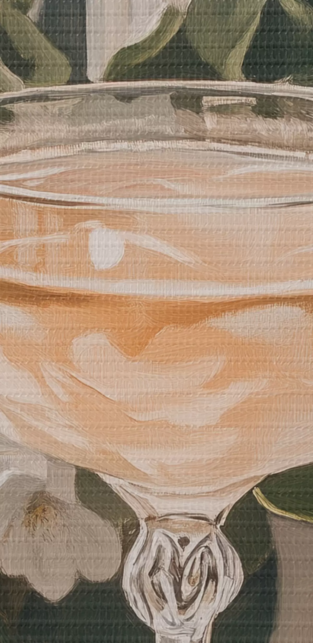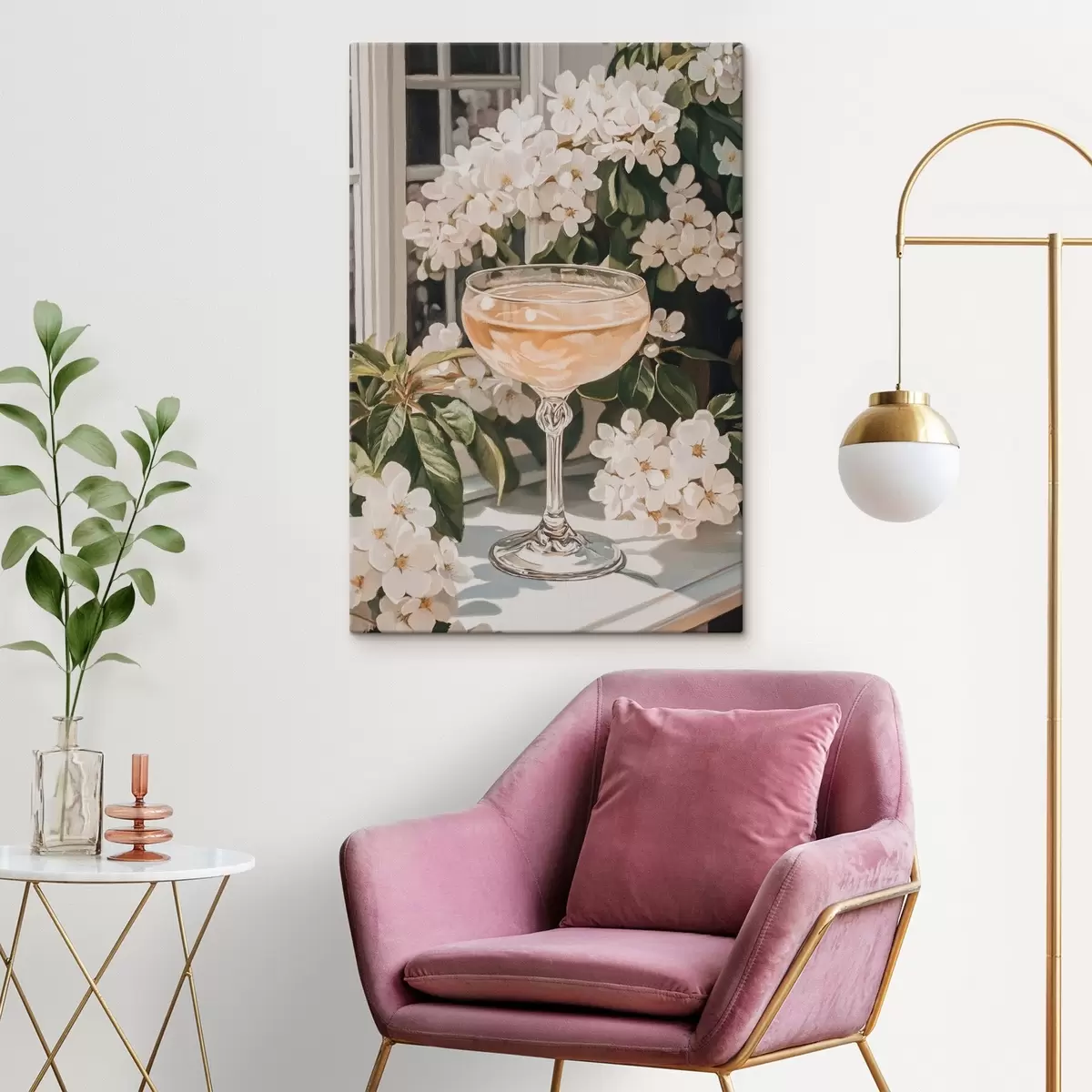 Gemälde Glas Champagner, Vintage, Aquarellstil, weiße Blumen Art. s43051