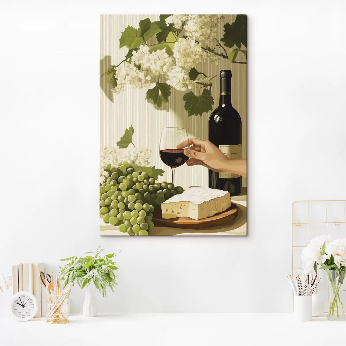 Gemälde Weintrauben mit Käse, Flasche Wein, Vintage-Stil, weiße Blumen Art. s43052