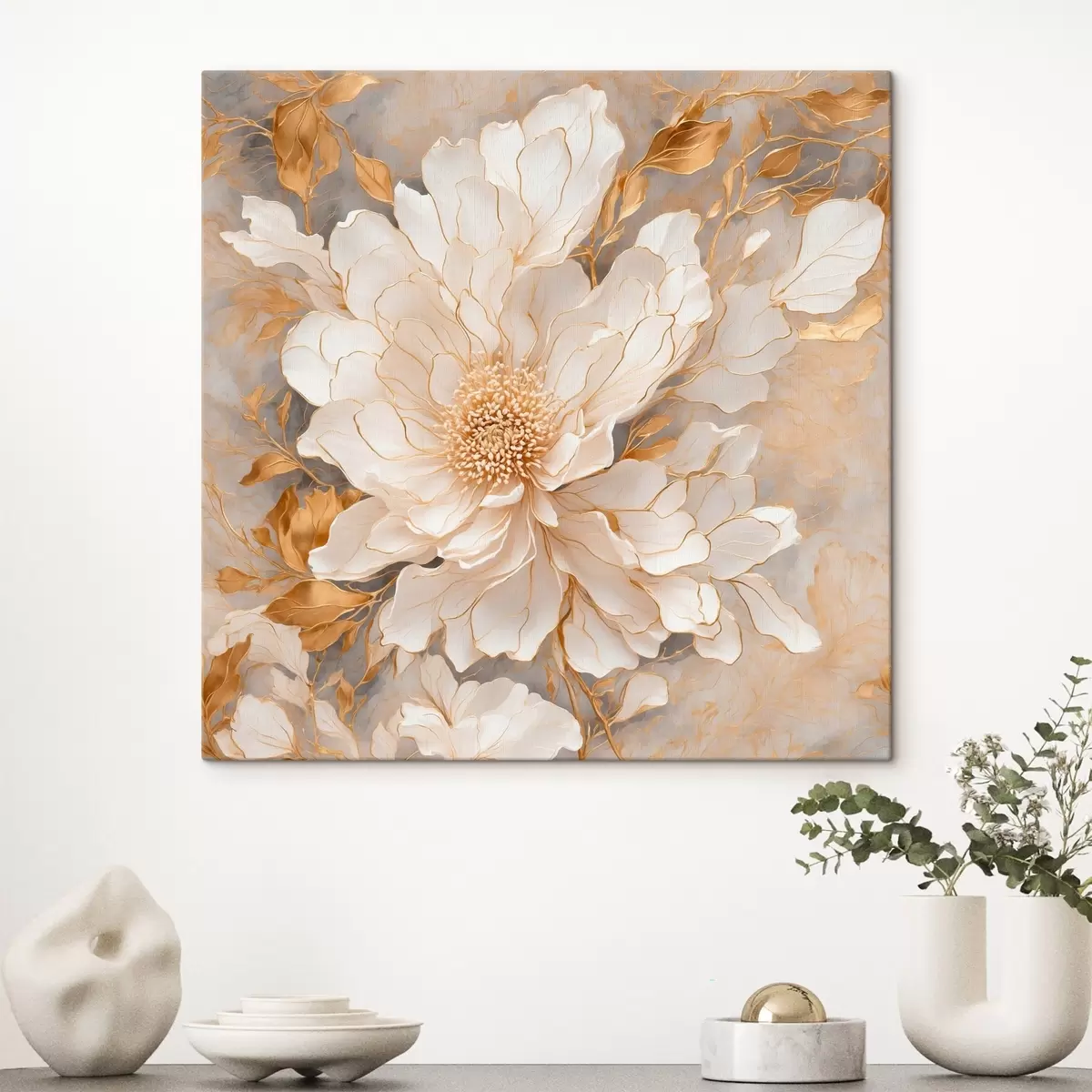 Gemälde Weiße Blume mit Blättern in Acrylmalerei Stil Art. s43115