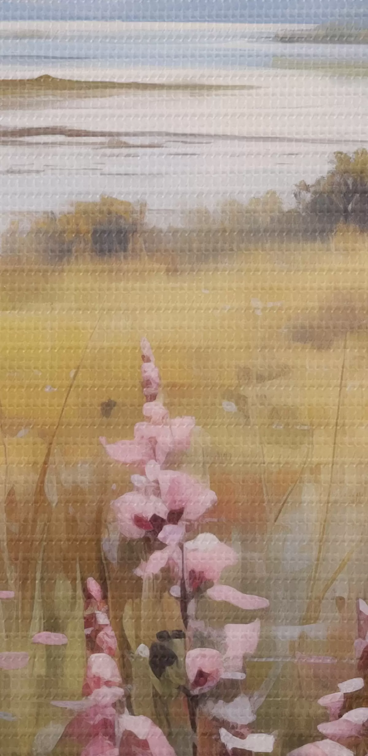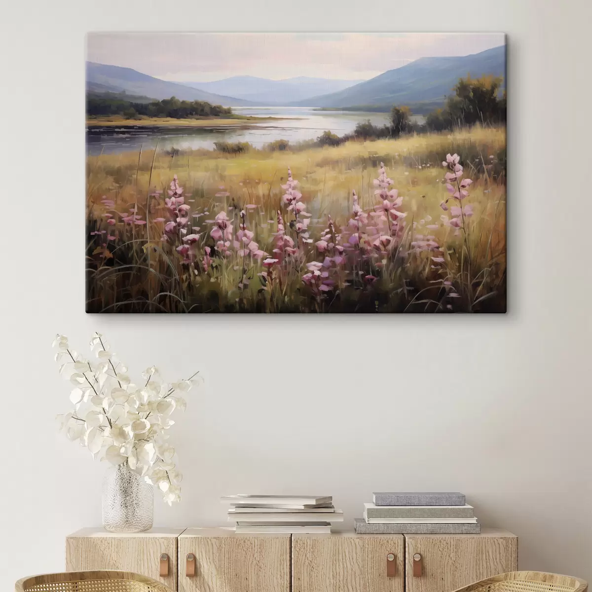 Gemälde Eine Landschaft mit einem Feld von rosa Blumen, einem See und Bergen im Hintergrund, unter einem bewölkten Himmel Art. s43165