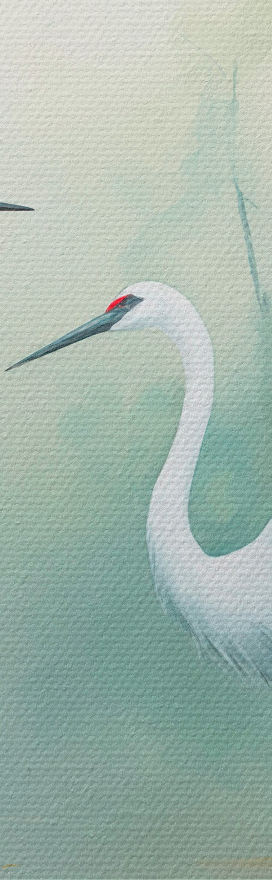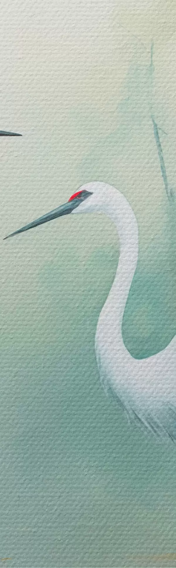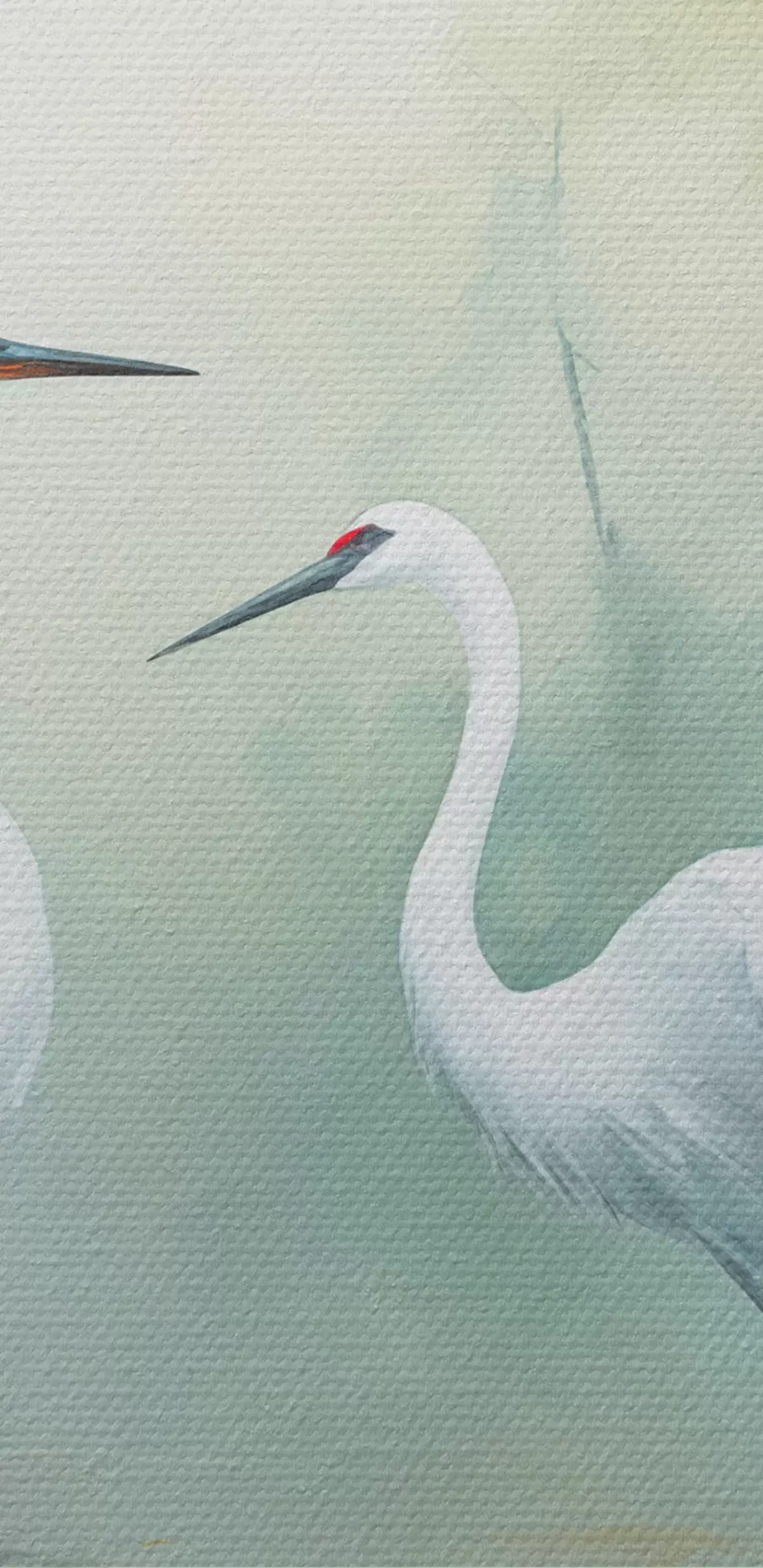 Gemälde Zwei weiße Kraniche, die in einem Teich stehen, umgeben von einem üppigen grünen Wald mit weicher, diffuser Beleuchtung Art. s43166